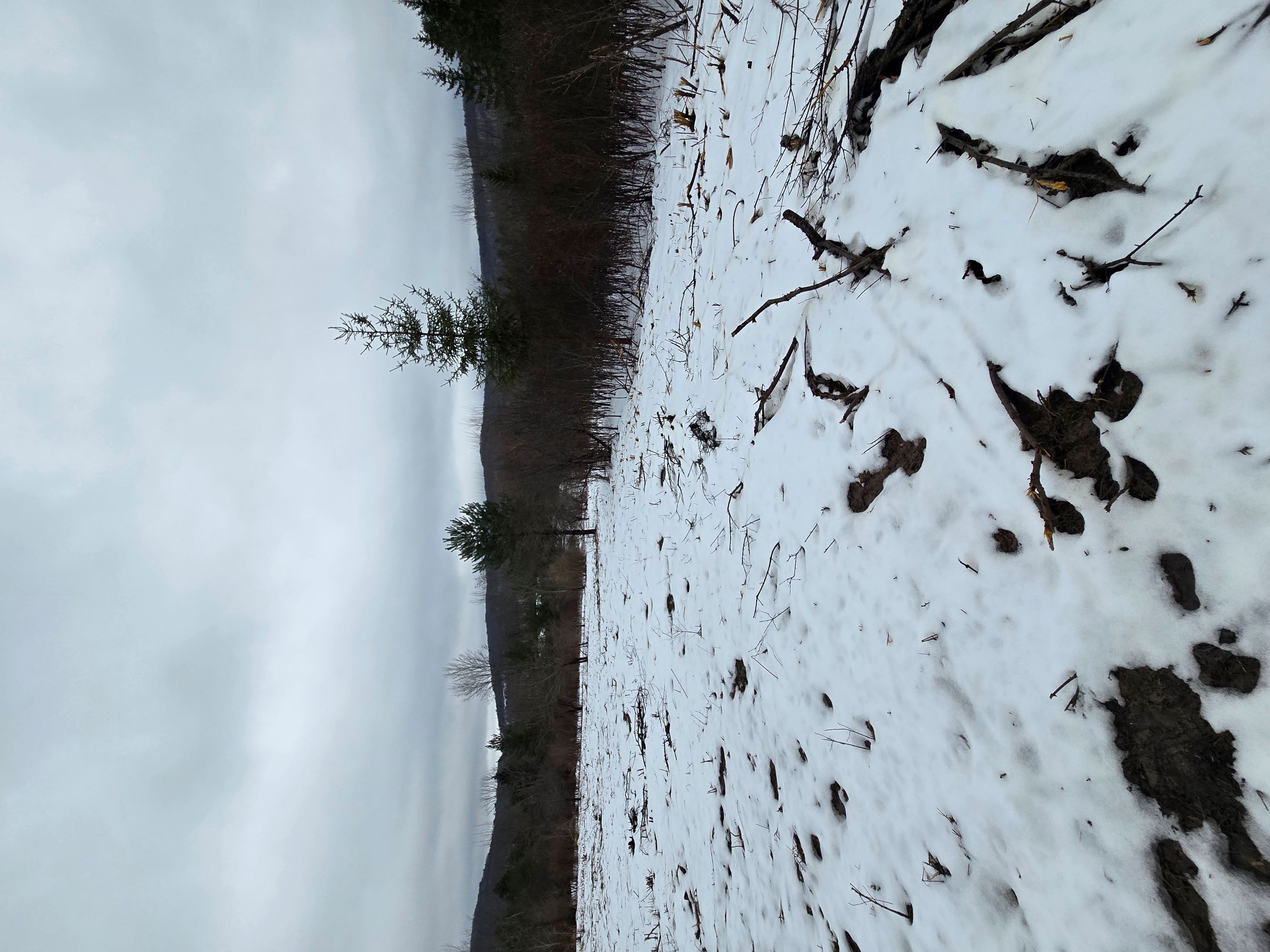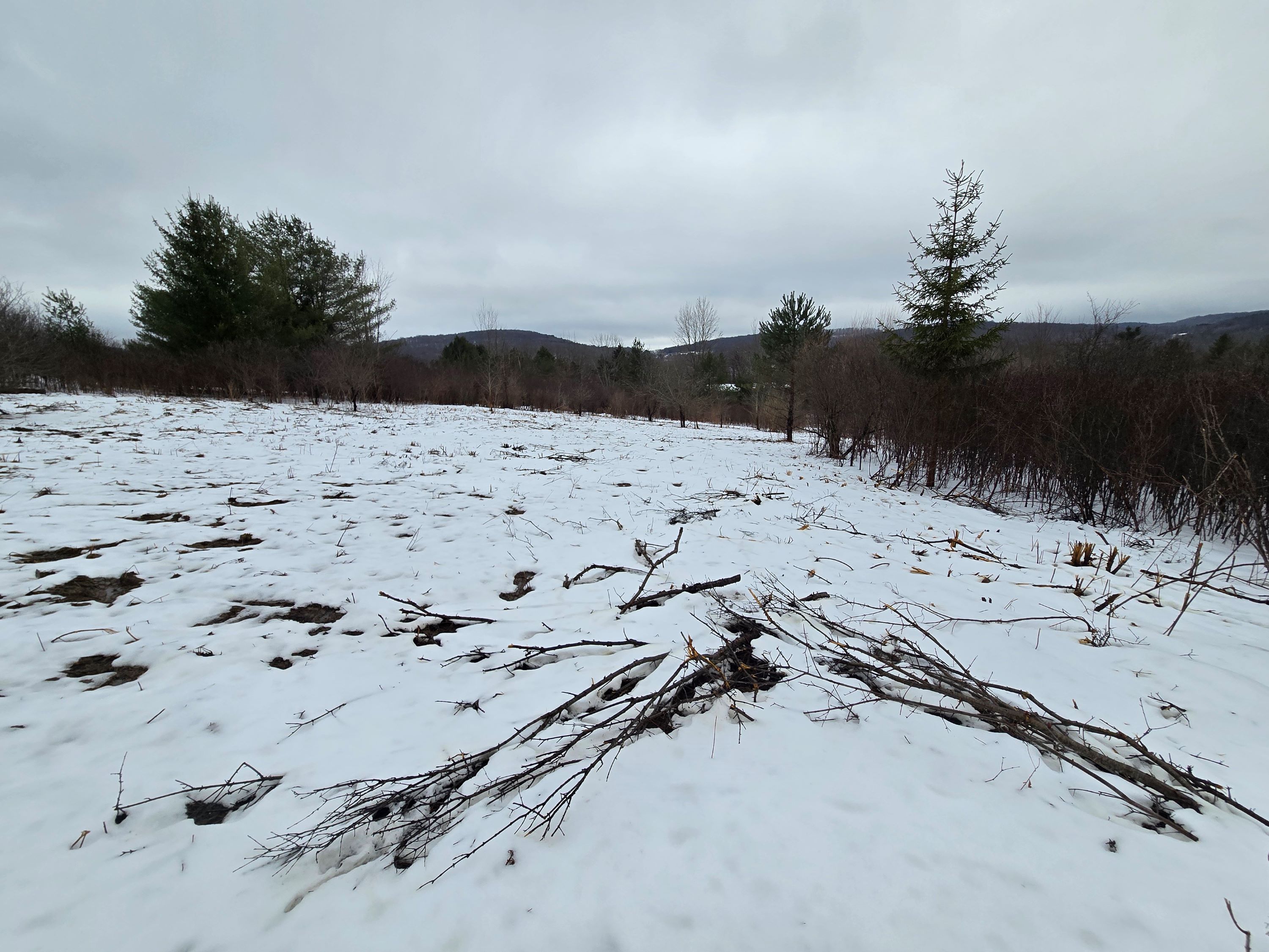 The land is fairly level with a gentle slope and features a mix of scattered bushes, brush, and some trees. There is a cleared area near the road with an easy-access entrance which is an ideal area for building. With some additional clearing, you could create a spacious backyard and enjoy a beautiful view of the surrounding landscape.