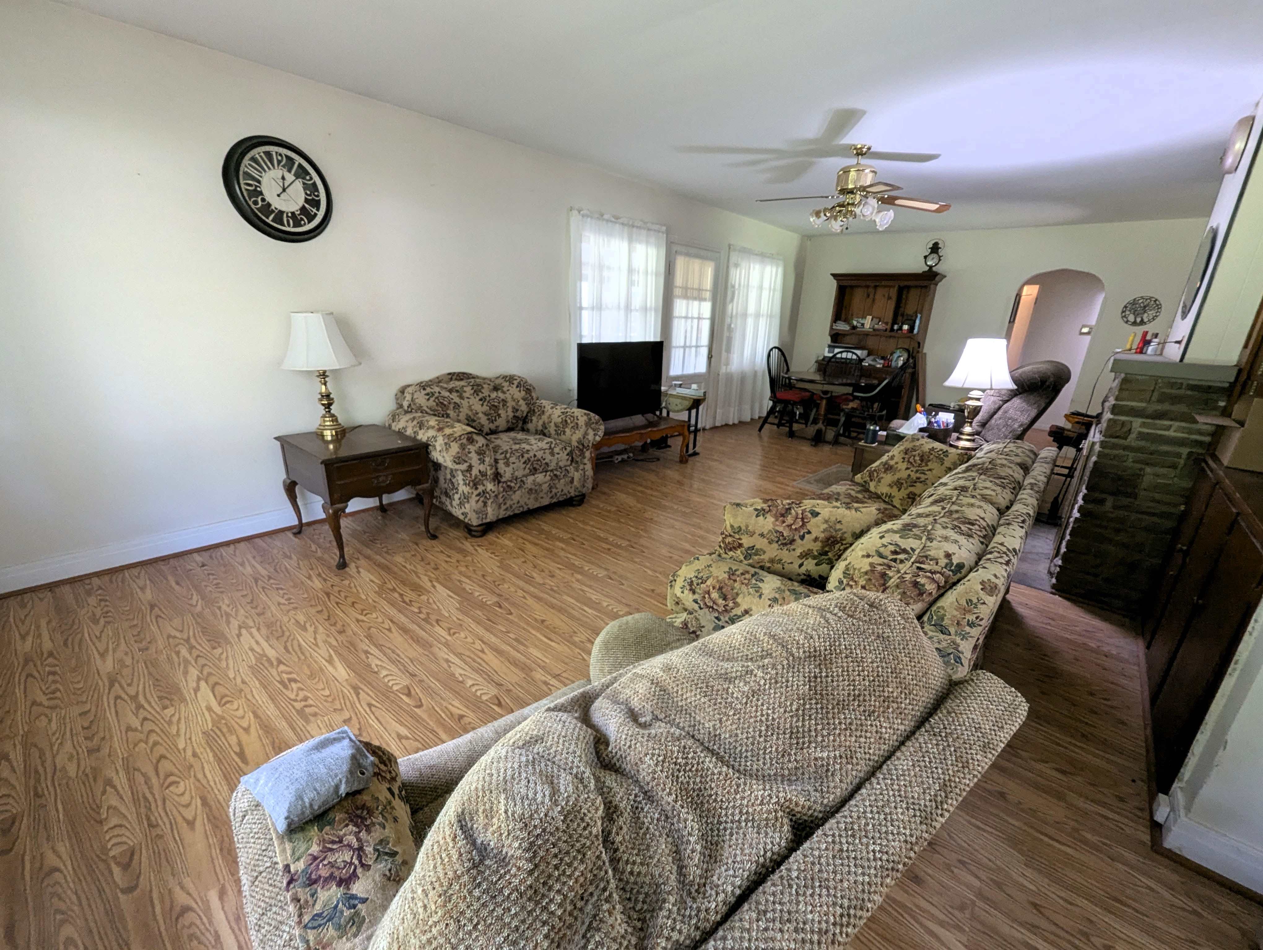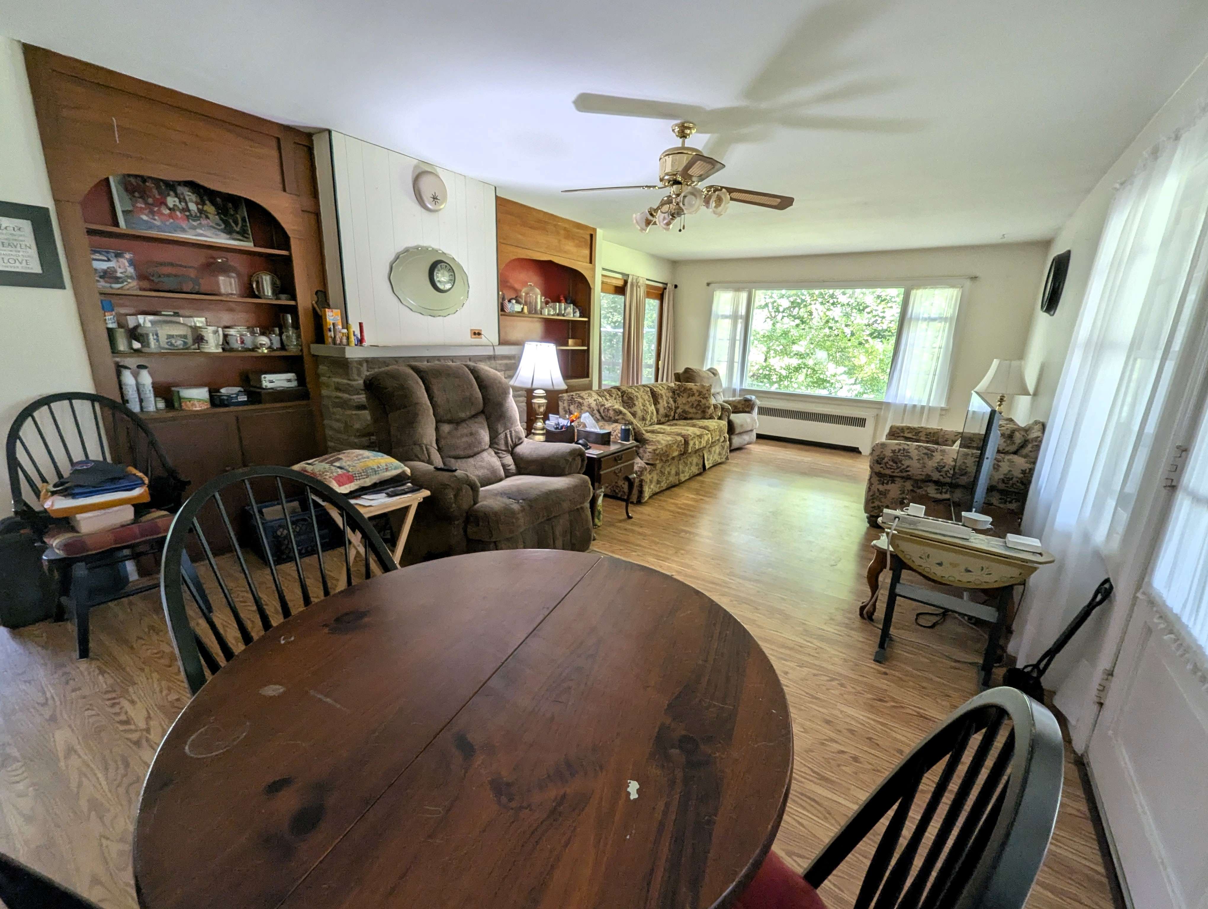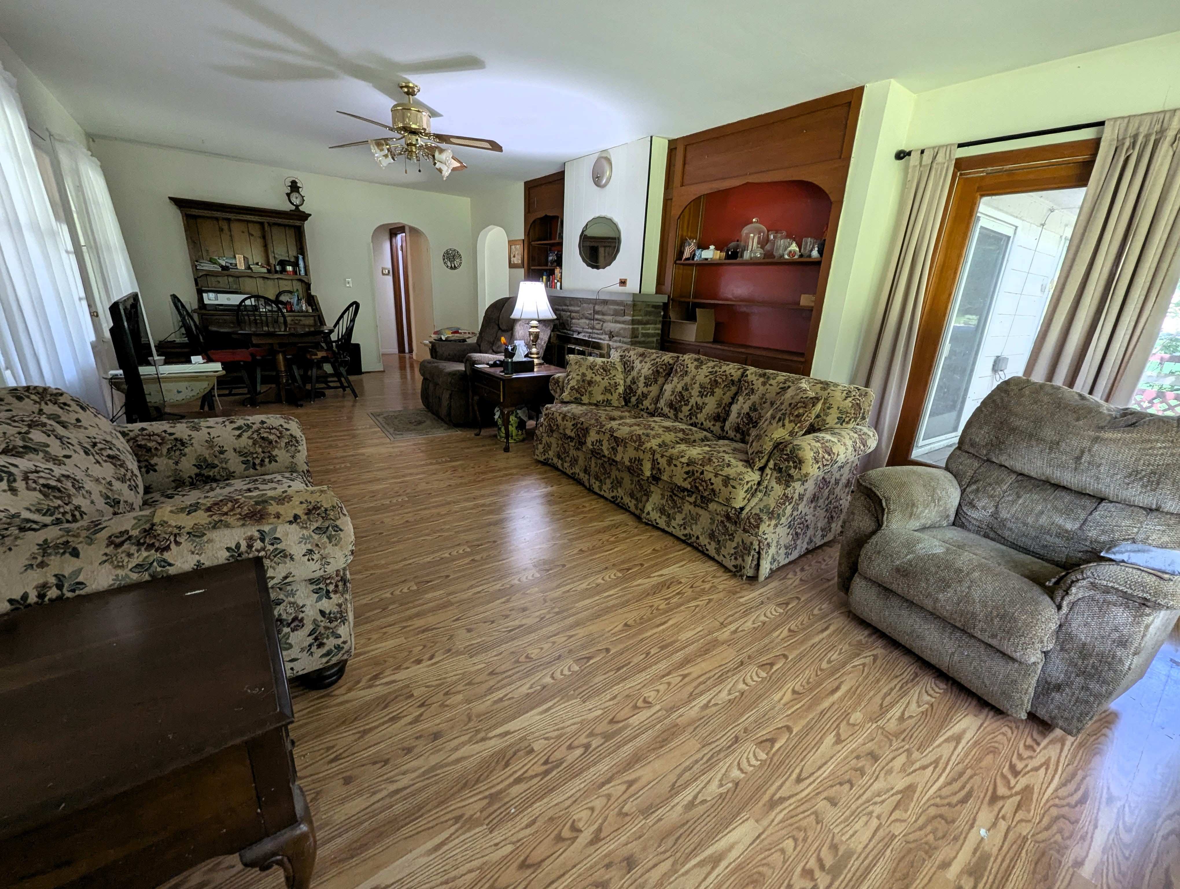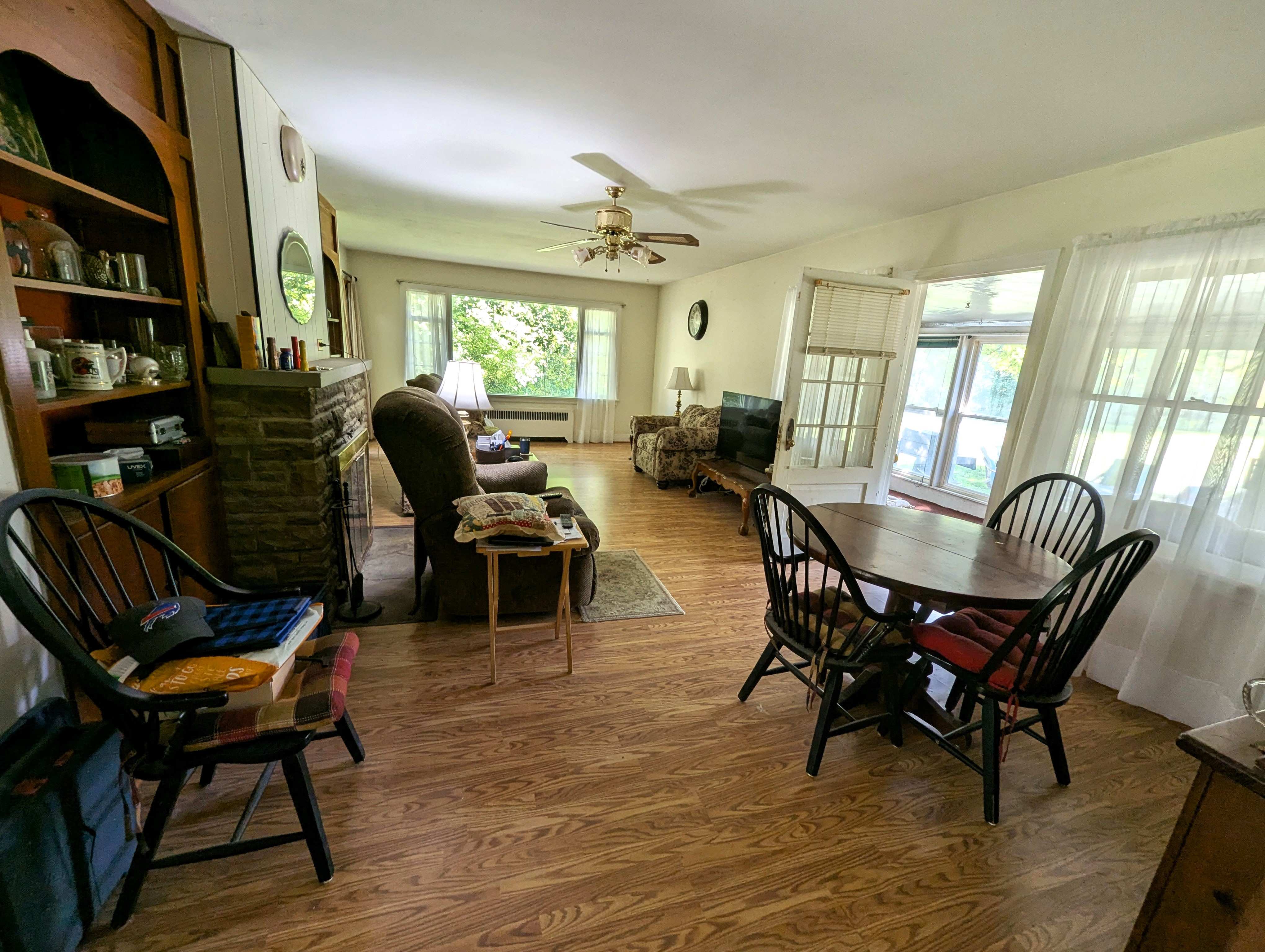Enter the home through the back patio into a sunroom, a bright, relaxing space with views of the expansive backyard. The spacious living room features a stone fireplace with a gas insert, perfect for cozy evenings. The kitchen boasts abundant cabinet space and a convenient wrap-around countertop, while a separate dining room, filled with natural light through a glass door, provides a welcoming area for entertainment and access to the side yard.