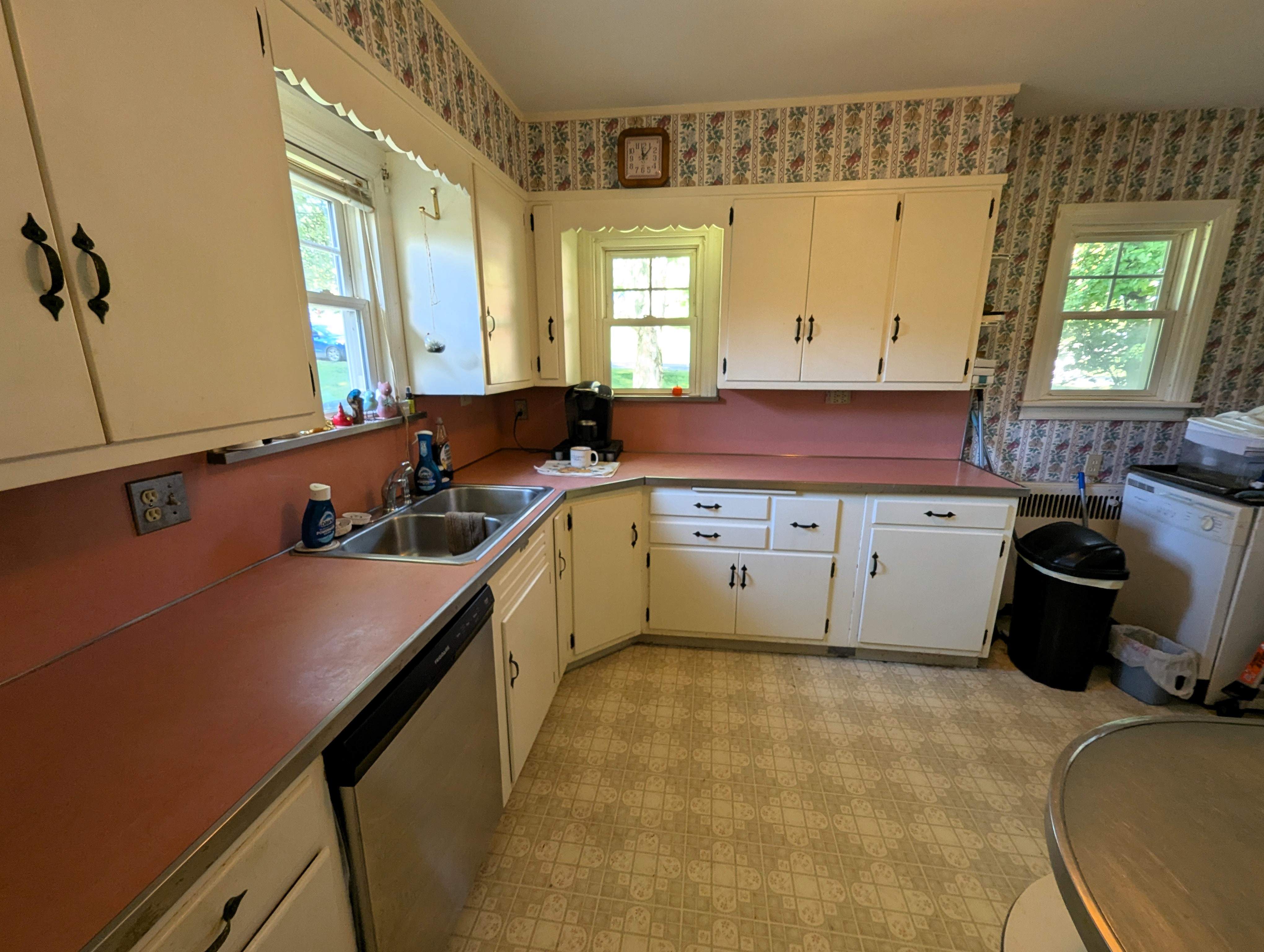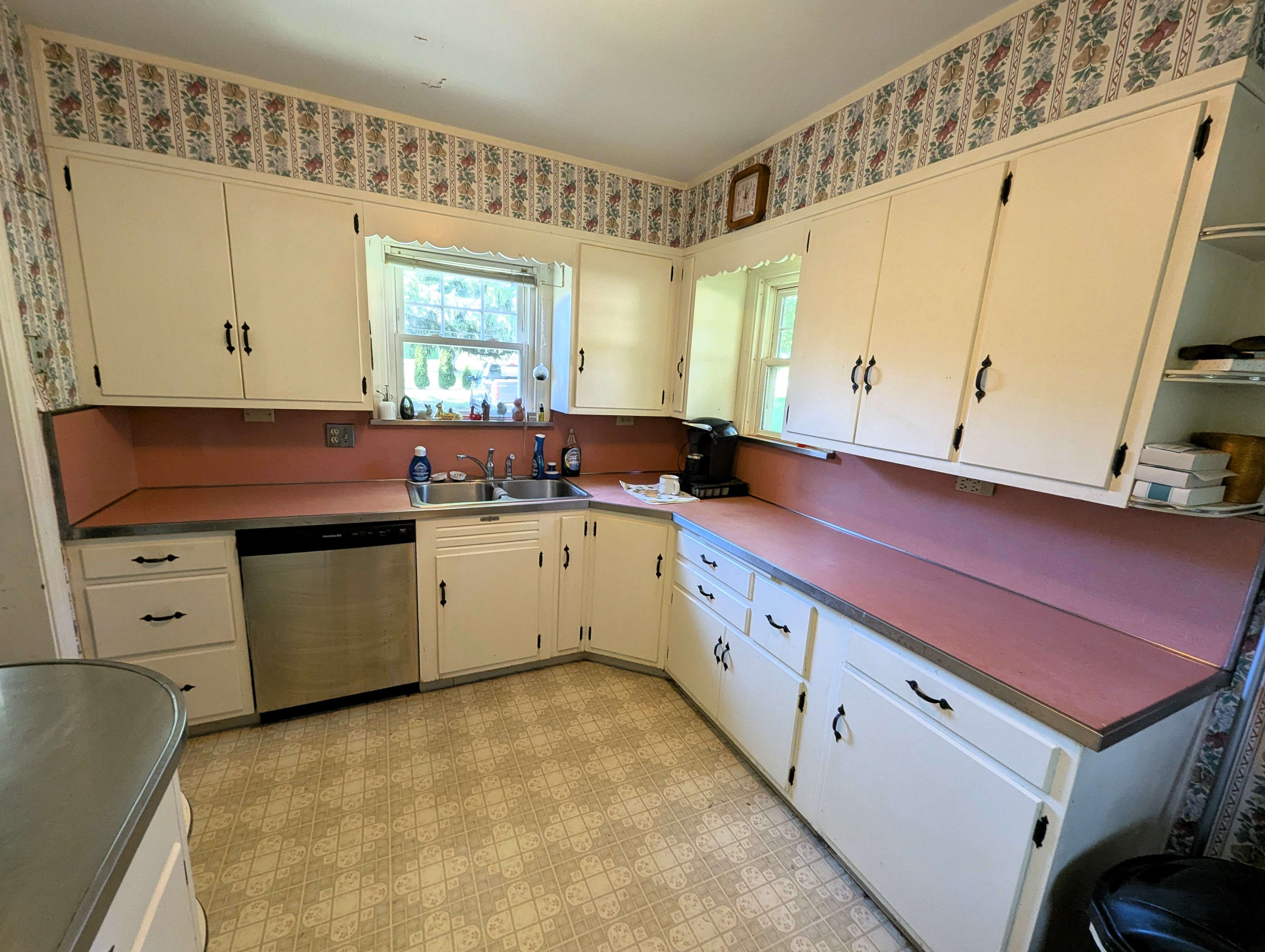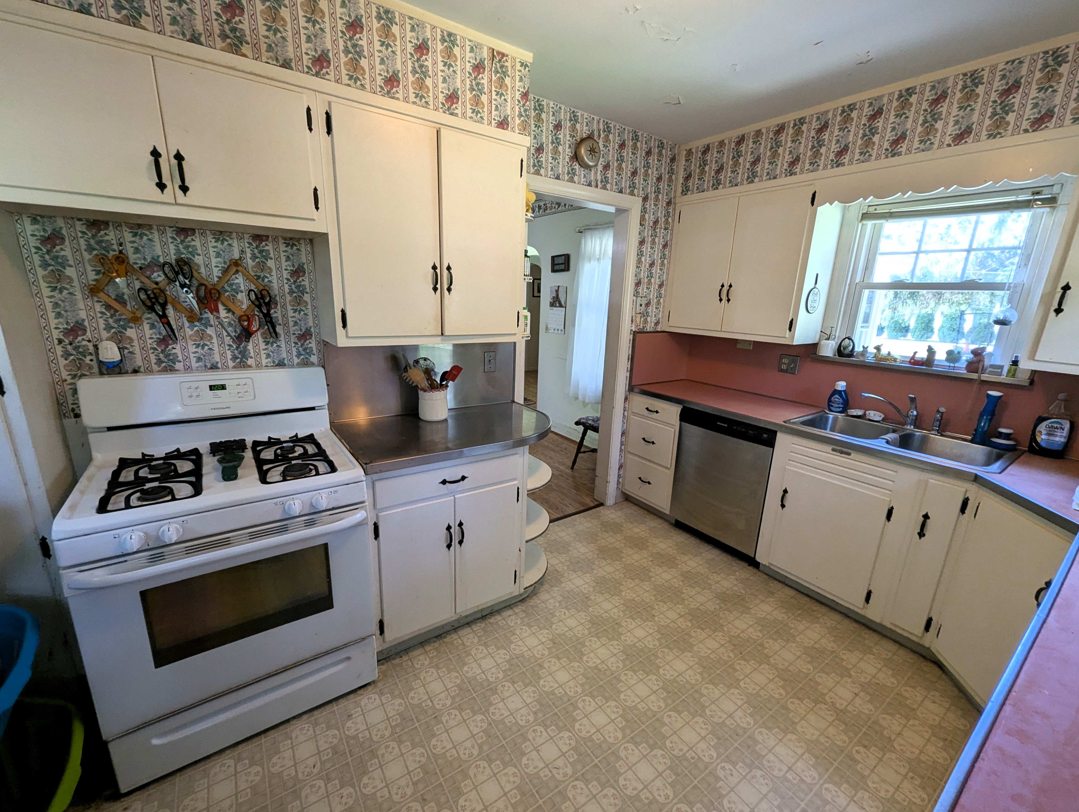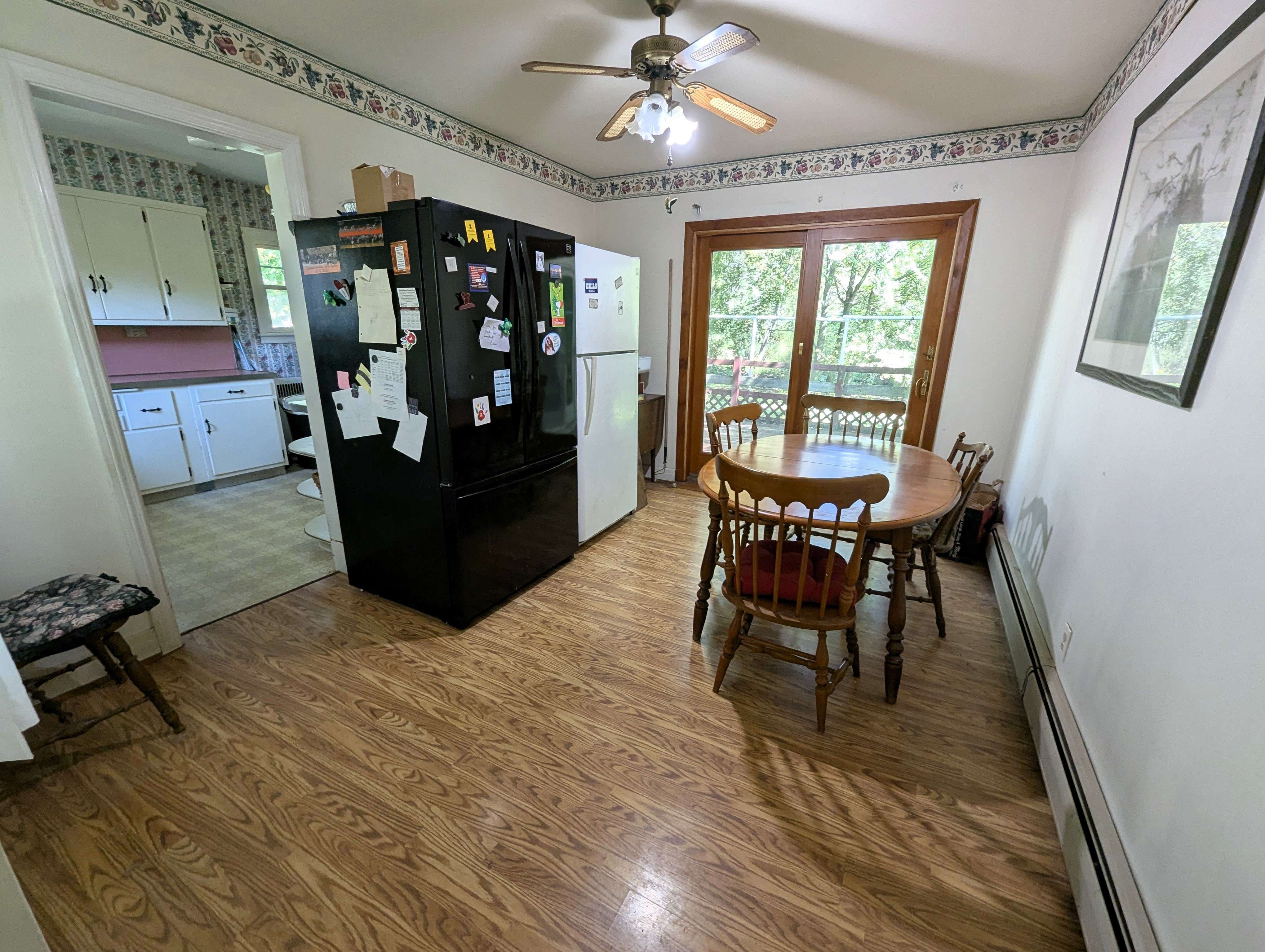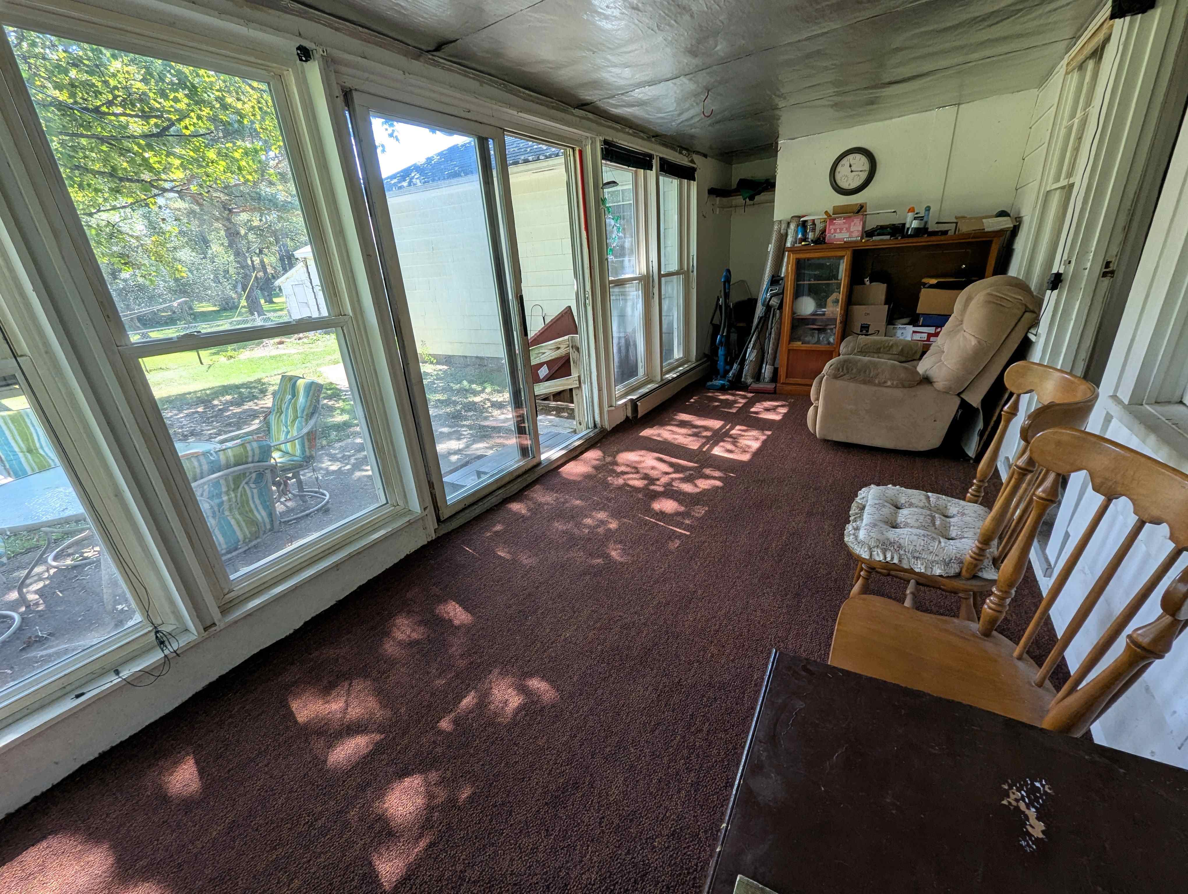 Enter the home through the back patio into a sunroom, a bright, relaxing space with views of the expansive backyard. The spacious living room features a stone fireplace with a gas insert, perfect for cozy evenings. The kitchen boasts abundant cabinet space and a convenient wrap-around countertop, while a separate dining room, filled with natural light through a glass door, provides a welcoming area for entertainment and access to the side yard.