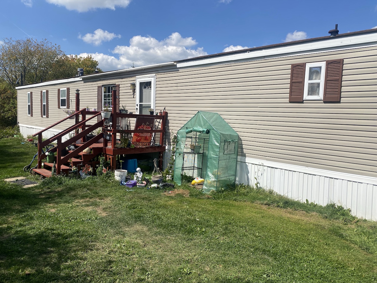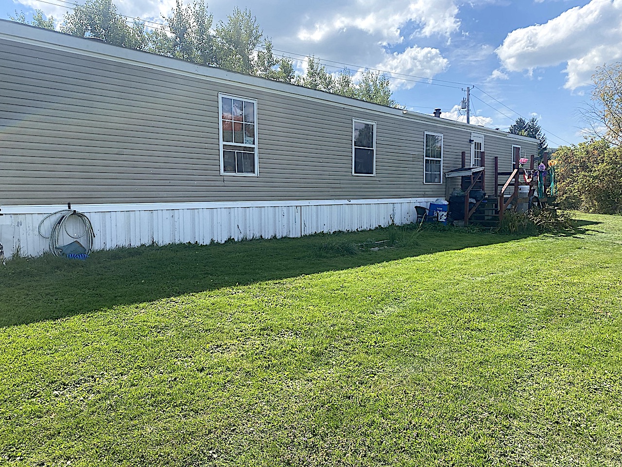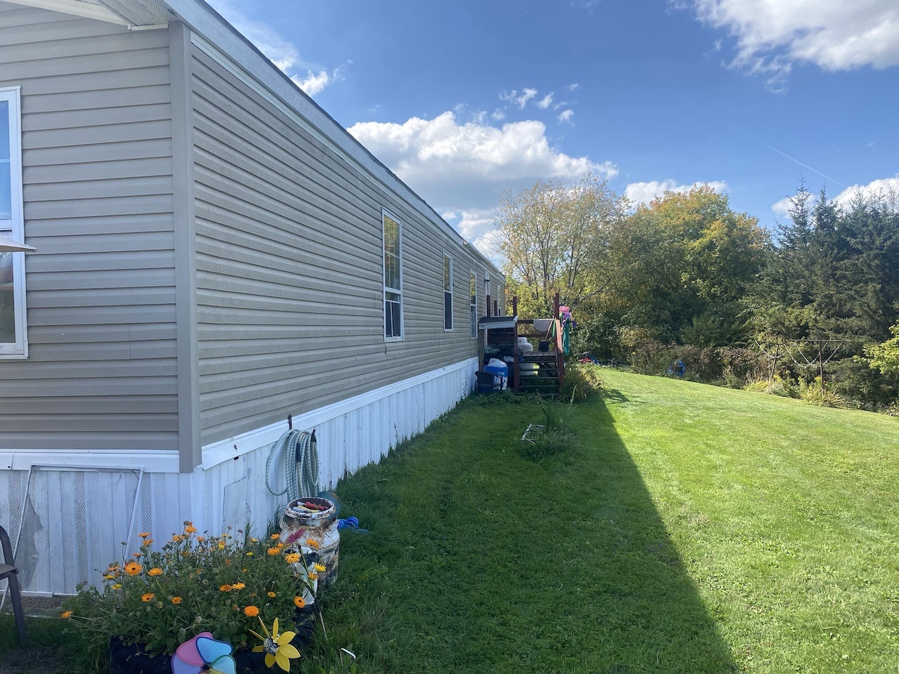 This solid three-bedroom manufactured home sits high on the land providing stunning views overlooking the large pole barn and surrounding valley. This property is located just a few hundred yards from Interstate 86 for excellent visibility and access. The home offers a cozy and comfortable interior and is being sold as-is.