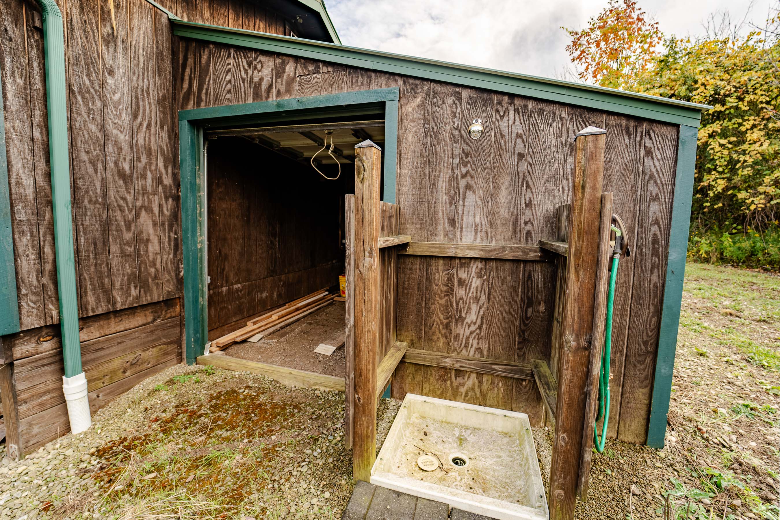 The cabin space is an open floor plan with a kitchen, a large space for a dining room or living space including a ceramic tile hearth pad in one corner for future heating installation if so desired. Turning the corner you’ll find the open bedroom area along with a walled-off bathroom location. This cabin features a fully off-grid setup for zero utility bills, however there is power available a short distance to the paved road. Current power is supplied via wind turbine and battery charging system located in the garage attached to the main cabin. This space also holds the battery bank system, on demand hot water tank, and outdoor shower area.