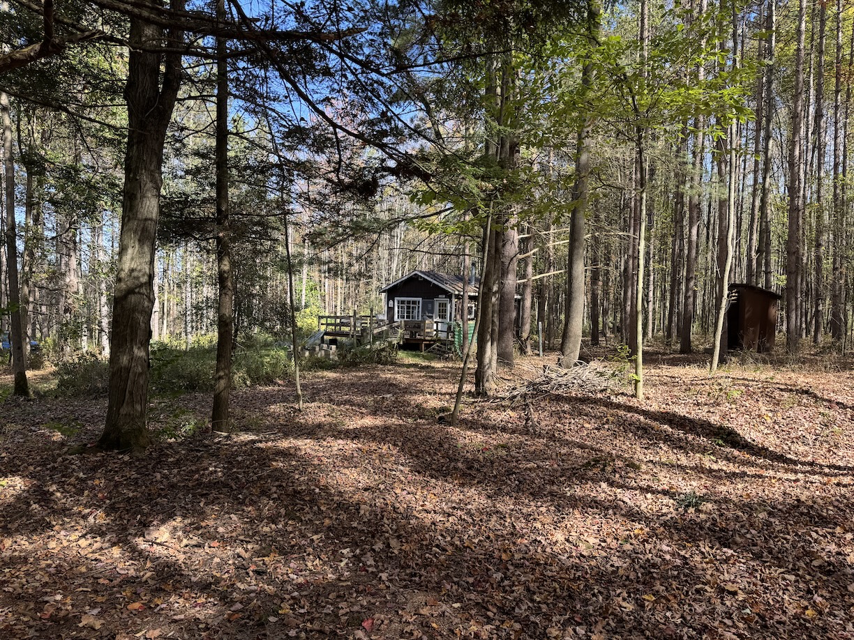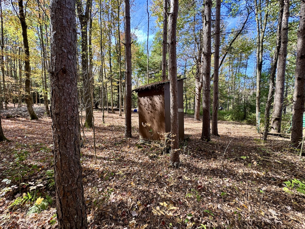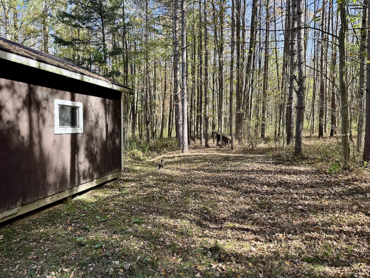 The wooded area features a well-maintained trail leading to a small off-grid hunting cabin that can be powered by a generator for electricity and propane for the cooking stove. There is a wood stove that provides heat. Electric and high-speed internet are available right at the road if you wish to connect in the future.