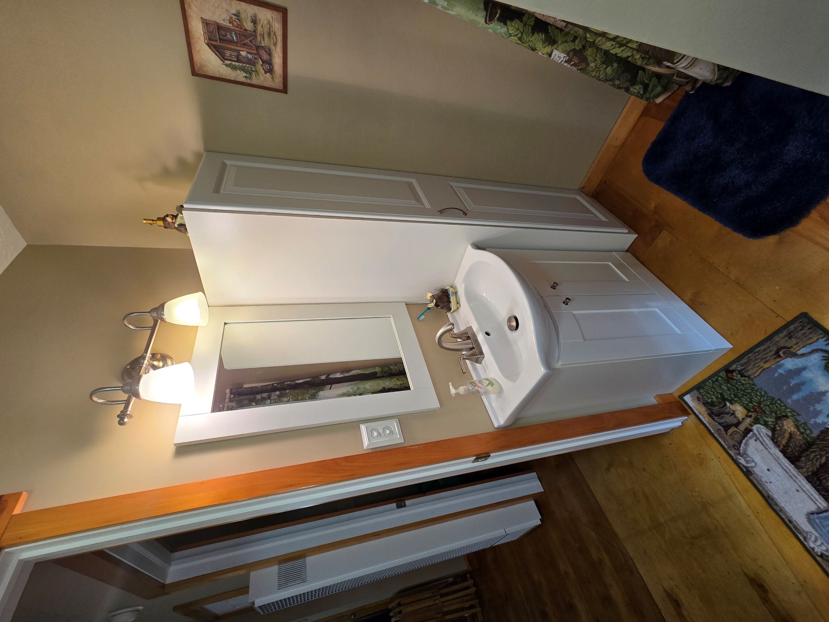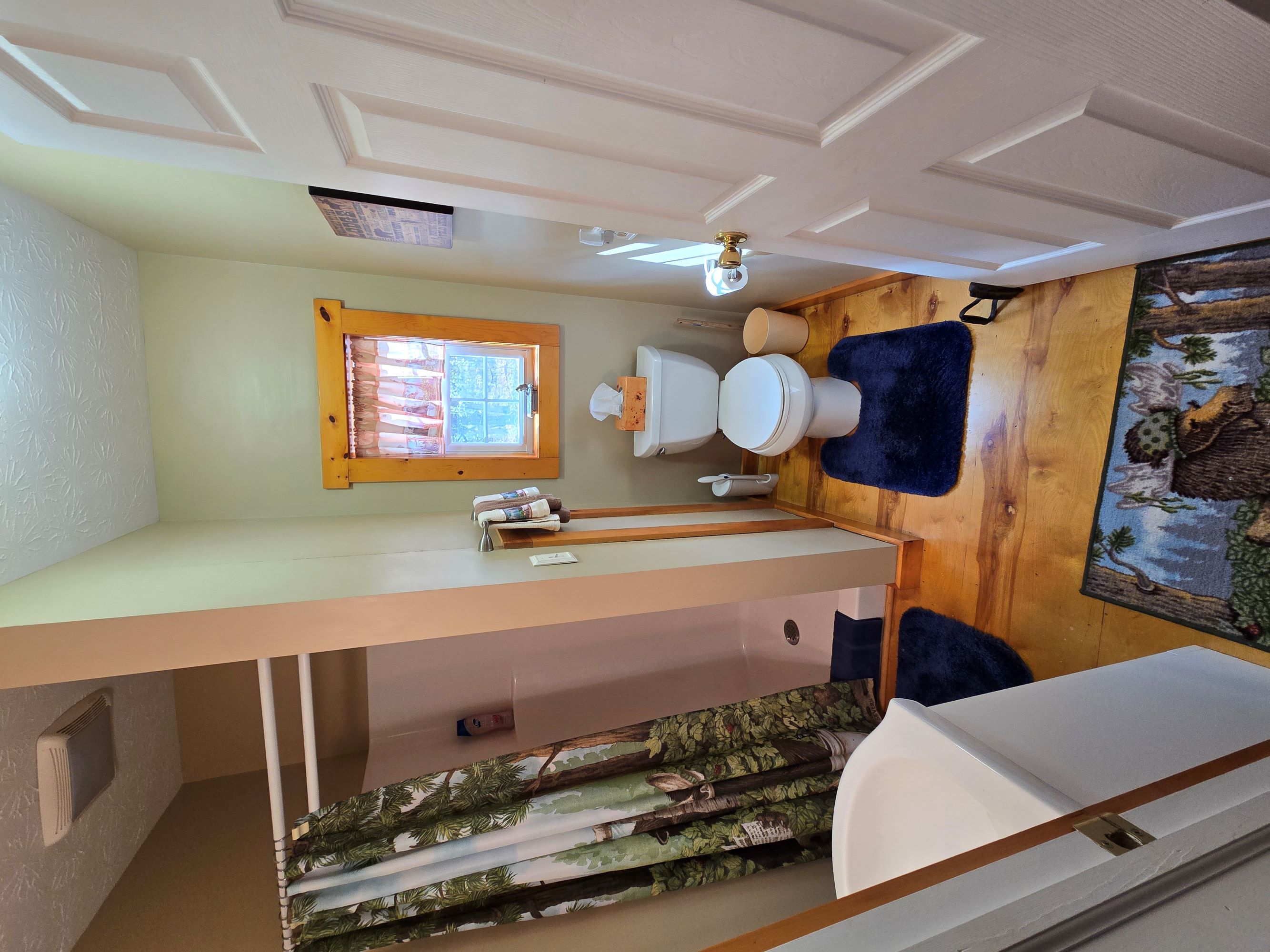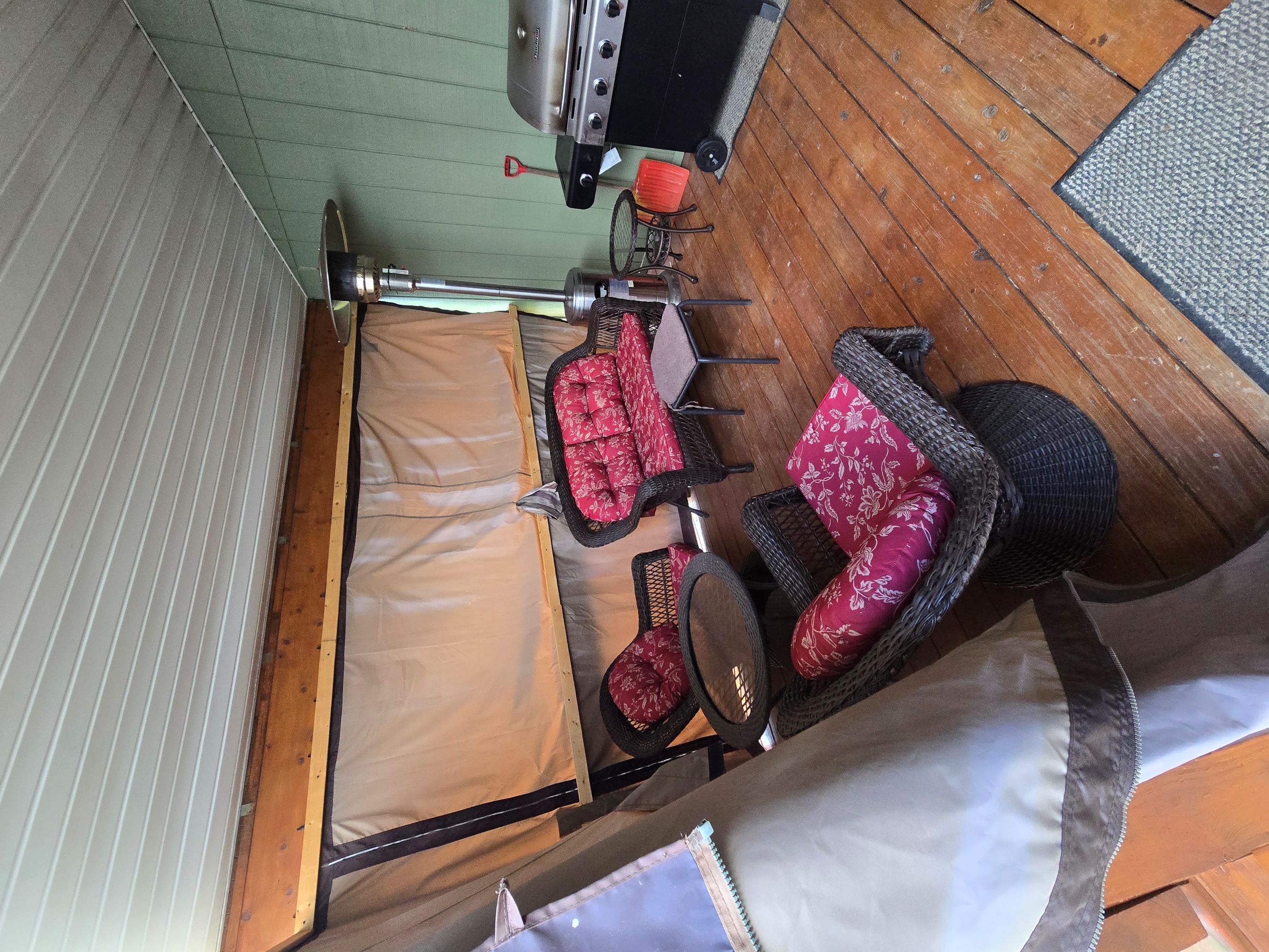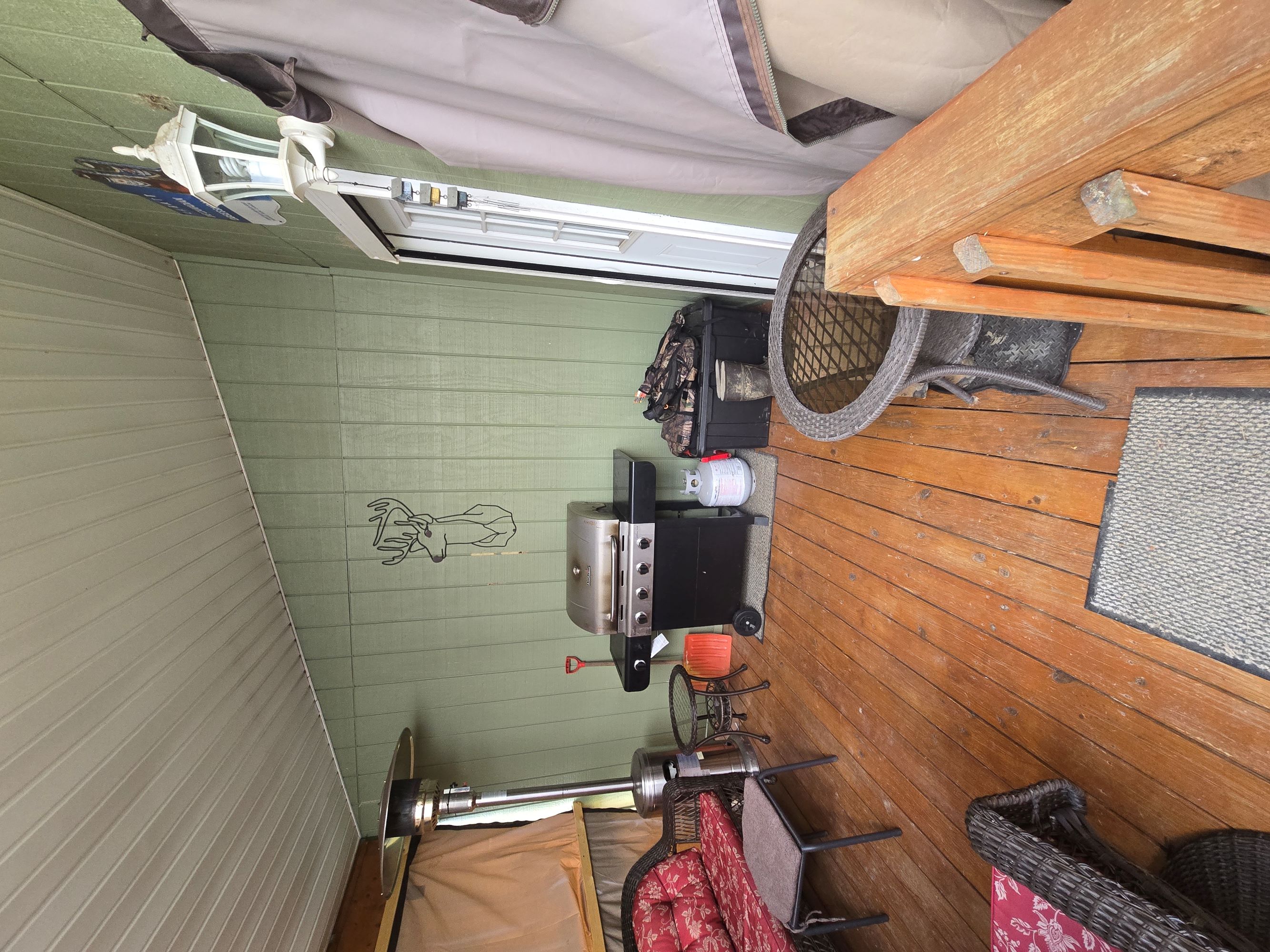 The view from the cabin’s deck overlooks the lawn and surrounding woods. You could enclose the deck and enjoy the view year-round. For added convenience, a shed and a pop-up garage provide ample storage for tools, tractors, and other equipment.