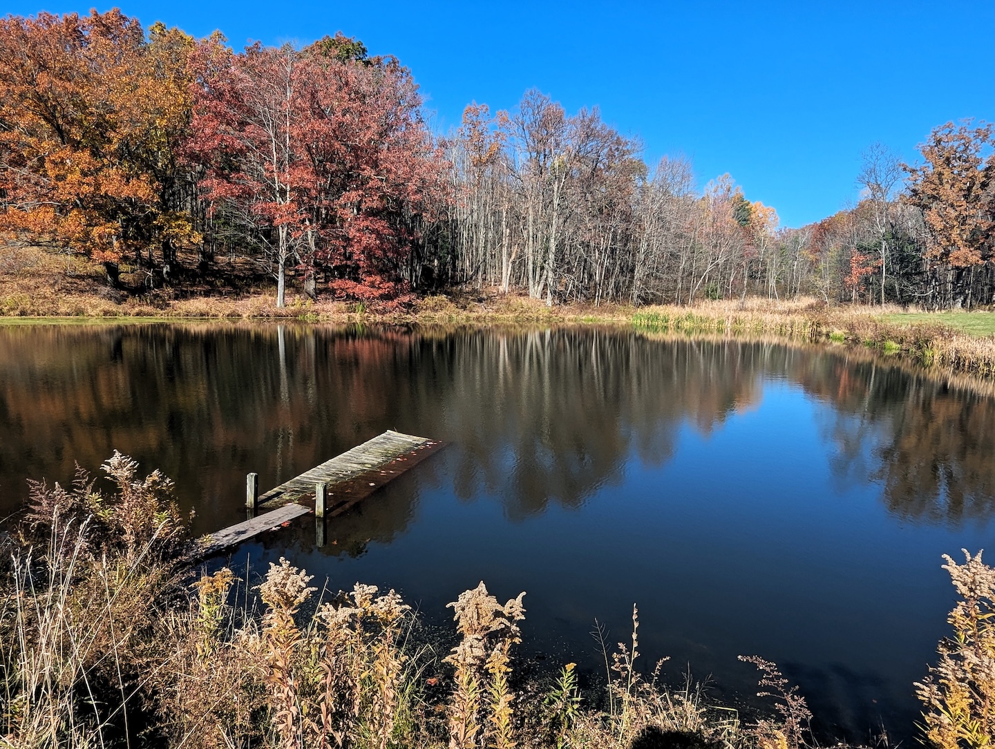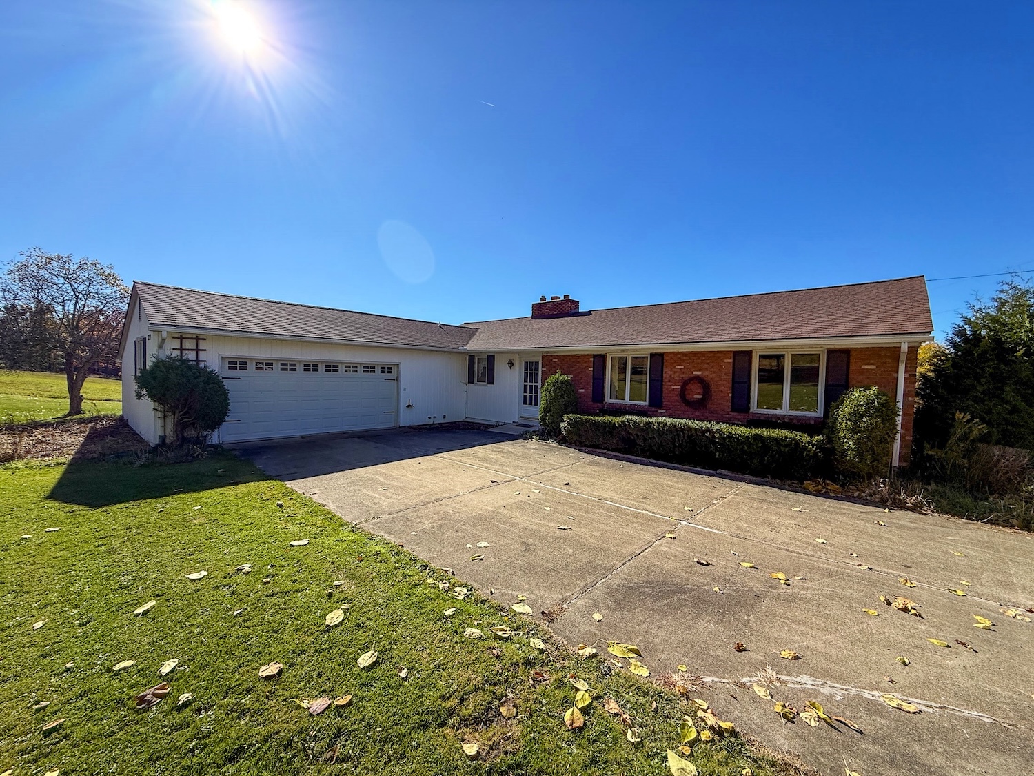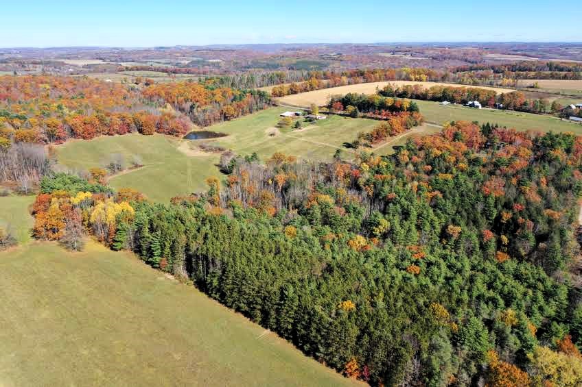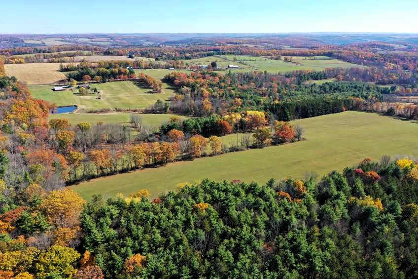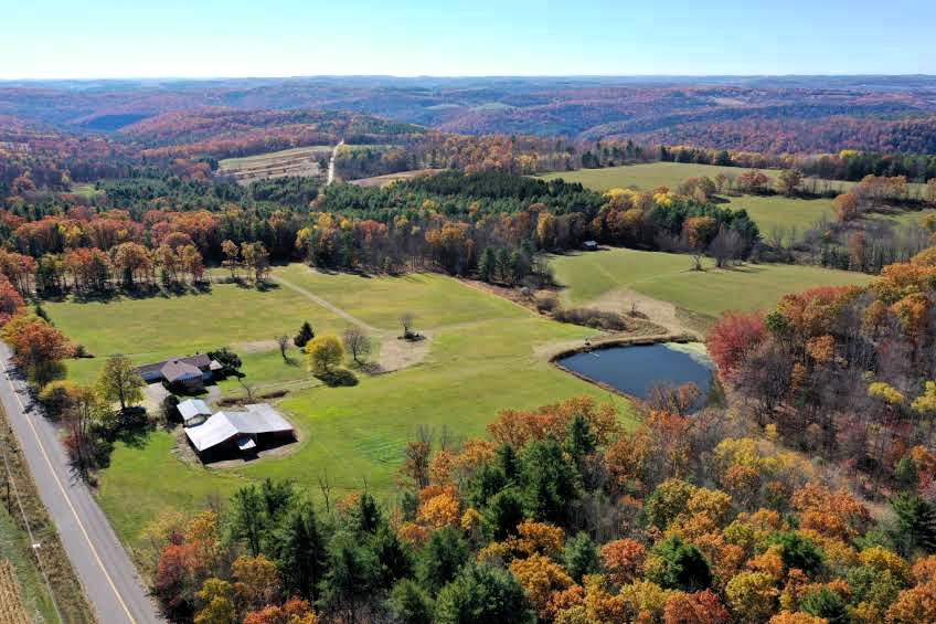 Set in the hills of southern Steuben County, this well-kept, ranch-style brick home sits on a picturesque 93 acres with an ideal mix of open ground and woods. A blacktop driveway just off the paved road leads to this spacious one-story home built on a poured concrete foundation. Across the drive, a versatile pole barn with concrete floors and electric has been used for livestock. From the expansive back deck, take in the sweeping views of the property, including a beautiful spring-fed pond and approximately 55 acres of farm fields. The balance of the acreage is mixed woodlands with stands of red and white pine, and a small year-round creek meanders through the center of the land.