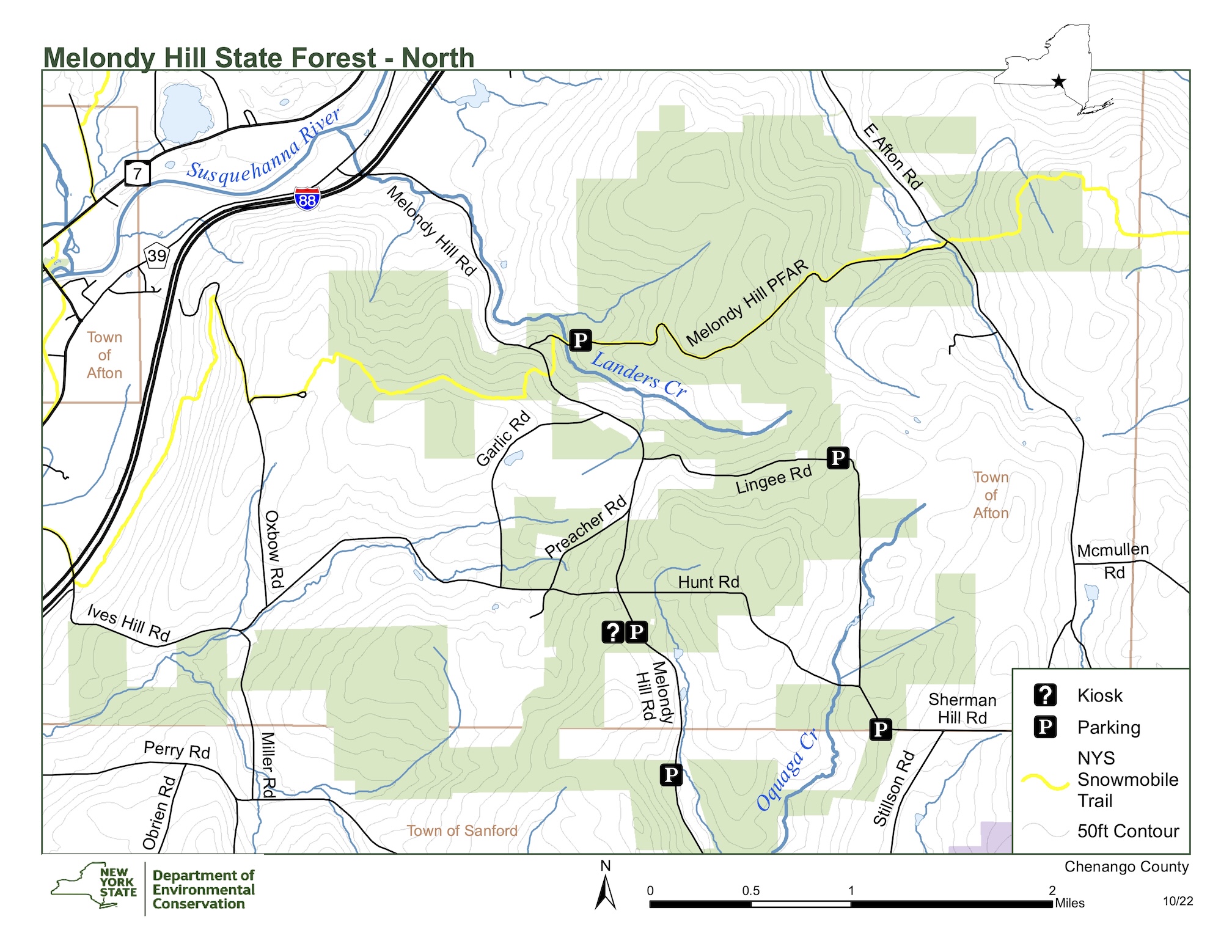 Melondy Hill State Forest is a destination for outdoor activities such as hiking, cross-country skiing, horseback riding, primitive camping, and hunting. The forest is known for its multiple-use trails, opportunities for wildlife viewing, and is part of a larger management unit in the foothills of the Catskill Mountains.