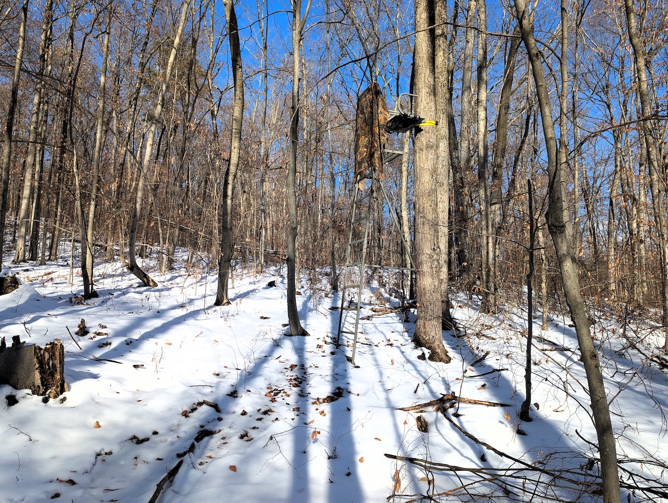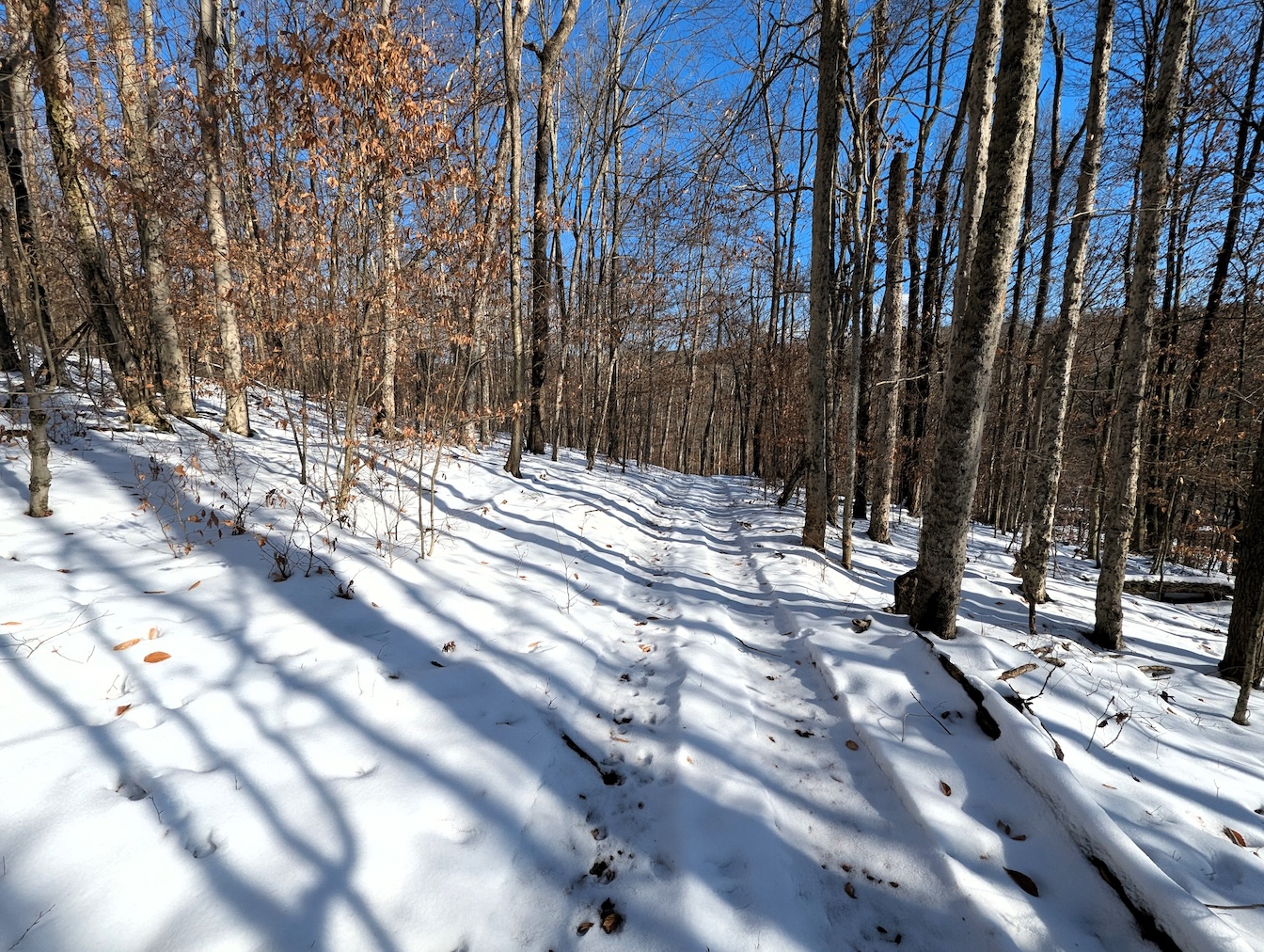 The land slopes gently from the road toward the back of the property where it borders an adjacent farm field. Well-established trails wind through the woods showcasing a healthy mix of oak, maple, and beech, and providing easy access for hiking, hunting, and recreation.