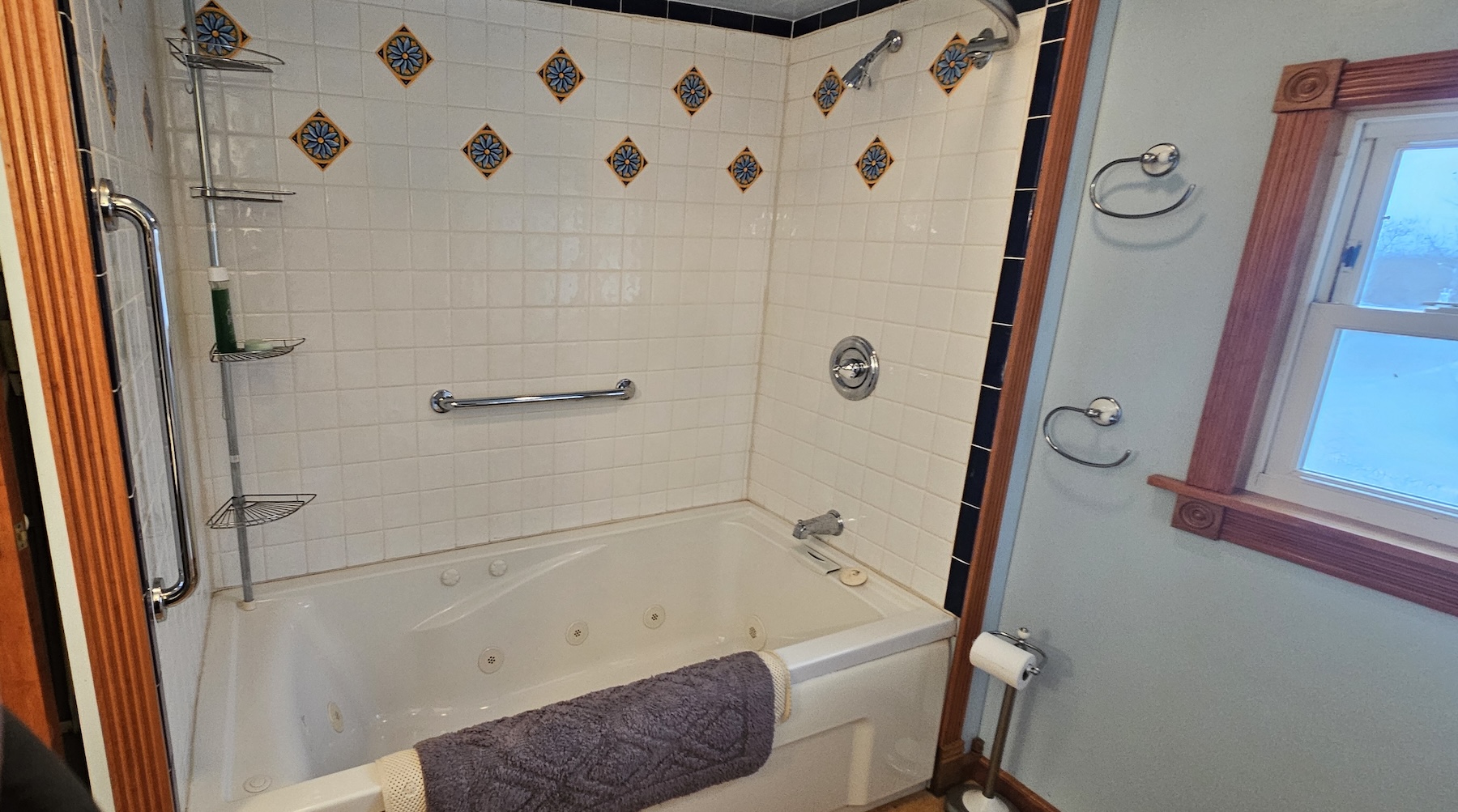 Inside, the home features four spacious bedrooms and two full baths, including a second-floor bathroom with an oversized jetted soaking tub. Original hardwood floors through parts of the home with laminate style flooring on the second floor. A formal dining room and generous living spaces are filled with natural light creating an open, comfortable atmosphere. The full attic offers additional storage or potential for future expansion.