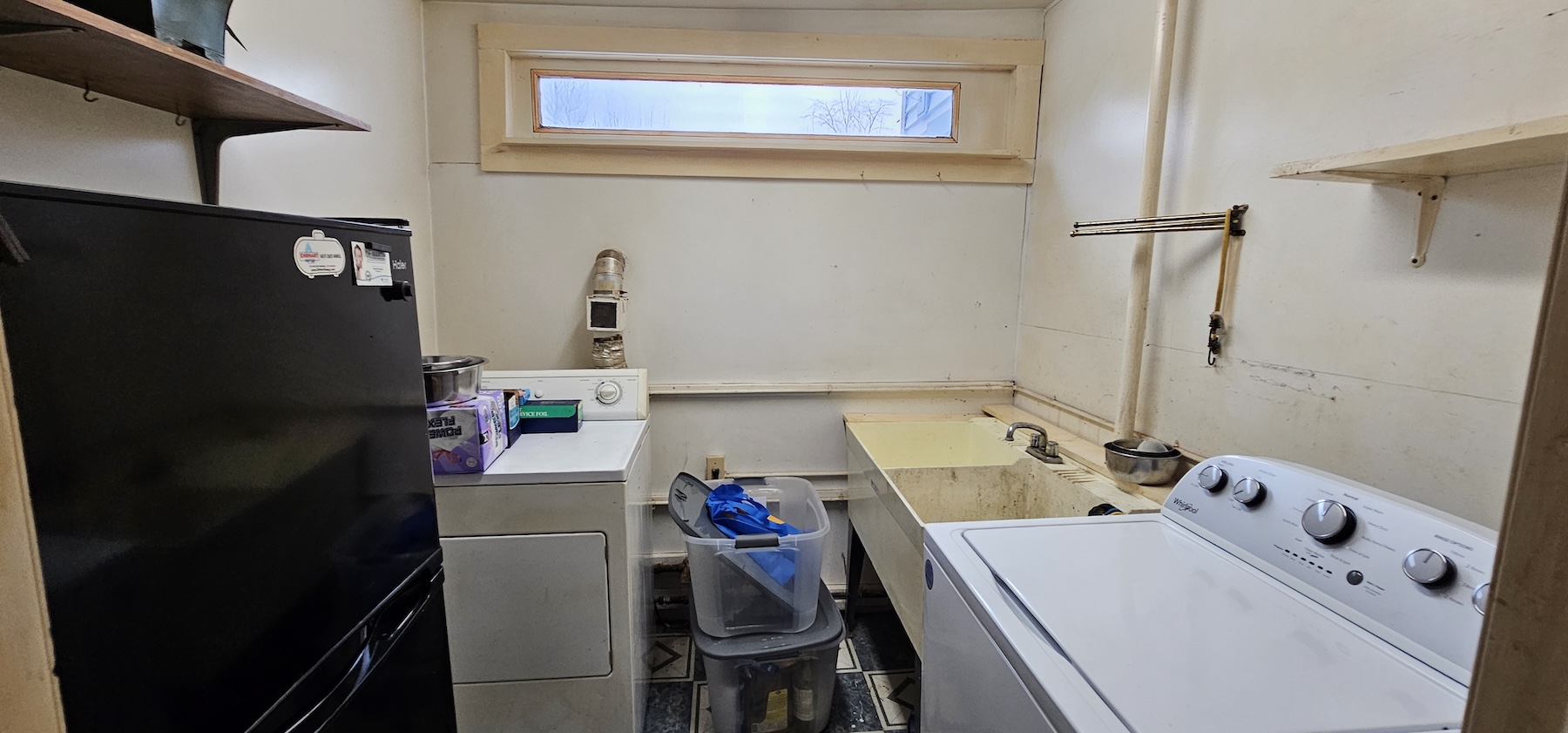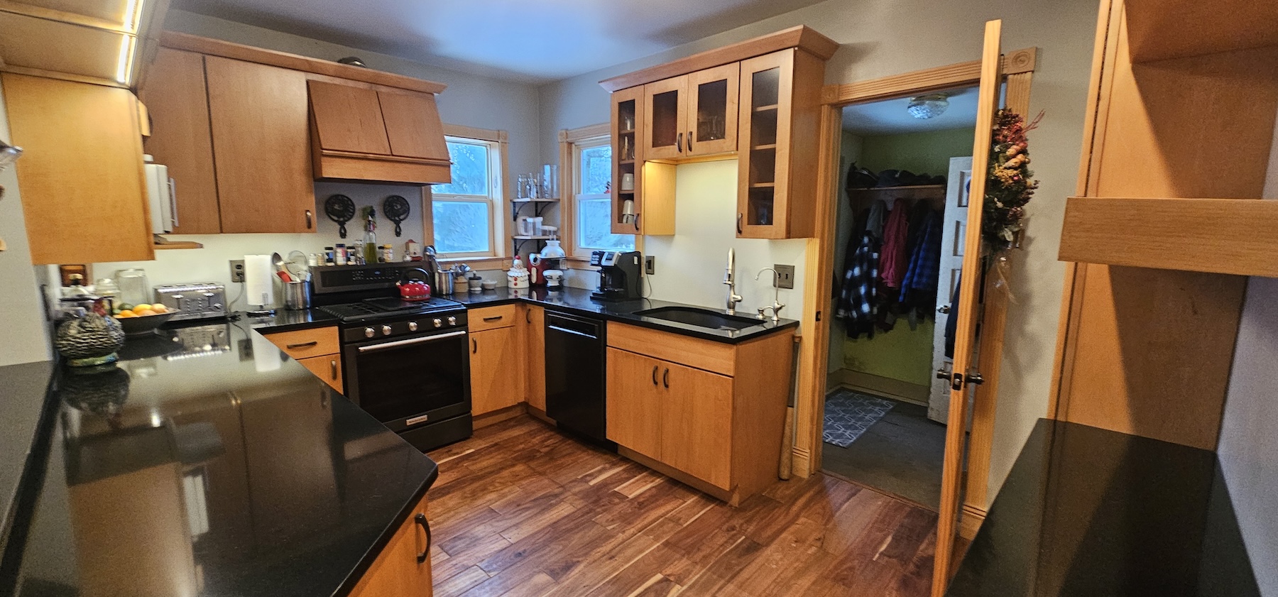 The modernized kitchen is standout featuring natural stone countertops, custom maple cabinets with soft-close drawers, a built-in refrigerator, built-in dishwasher, deep farmhouse-style well sink, and a dedicated cabinet mixer stand. Newer appliances and updated windows, siding, and mechanicals ensure efficiency and peace of mind. A designated laundry room adds convenience, and the washer and dryer convey with the sale. Central heat and air conditioning provide year-round comfort.