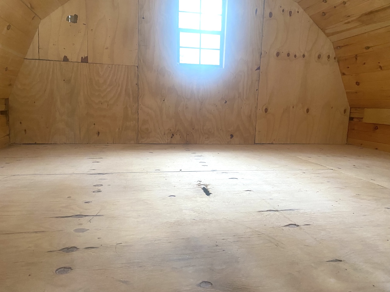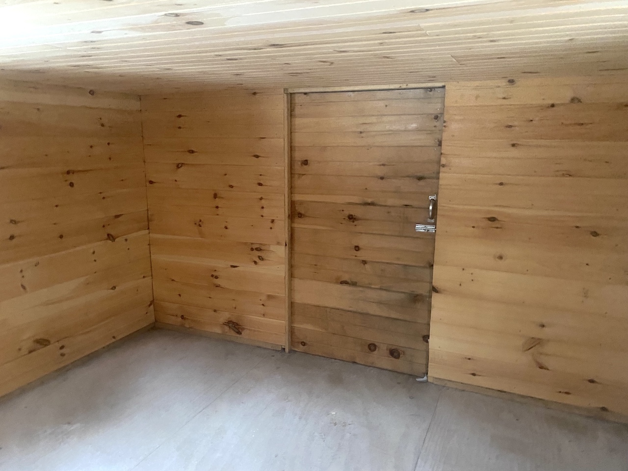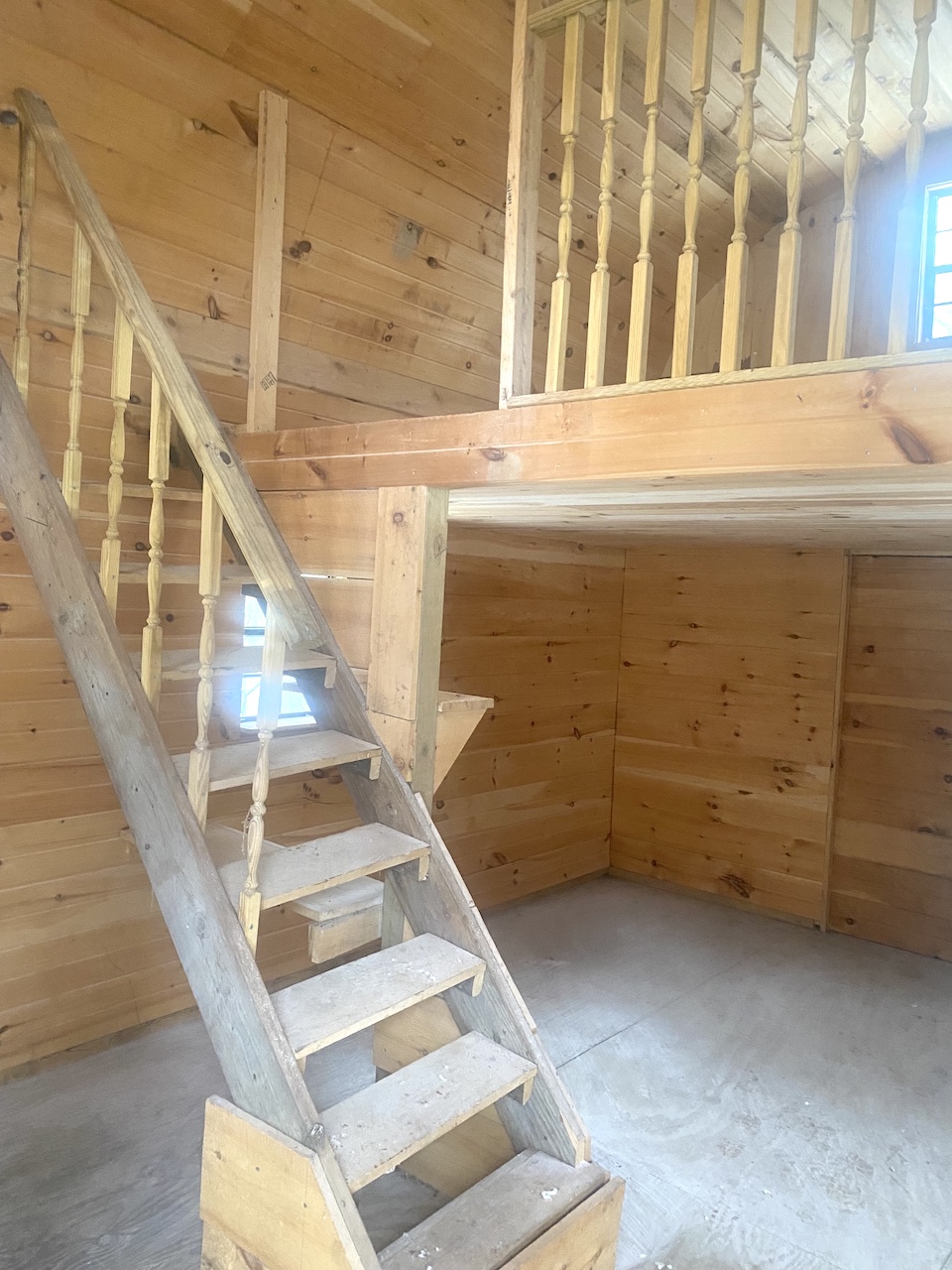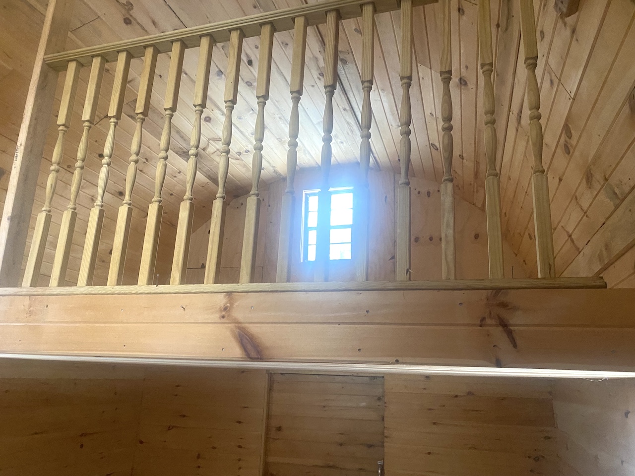 The cabin has a covered front porch. Inside, the walls and ceiling are finished with knotty pine boards. There is also a small loft area for sleeping or storage.
