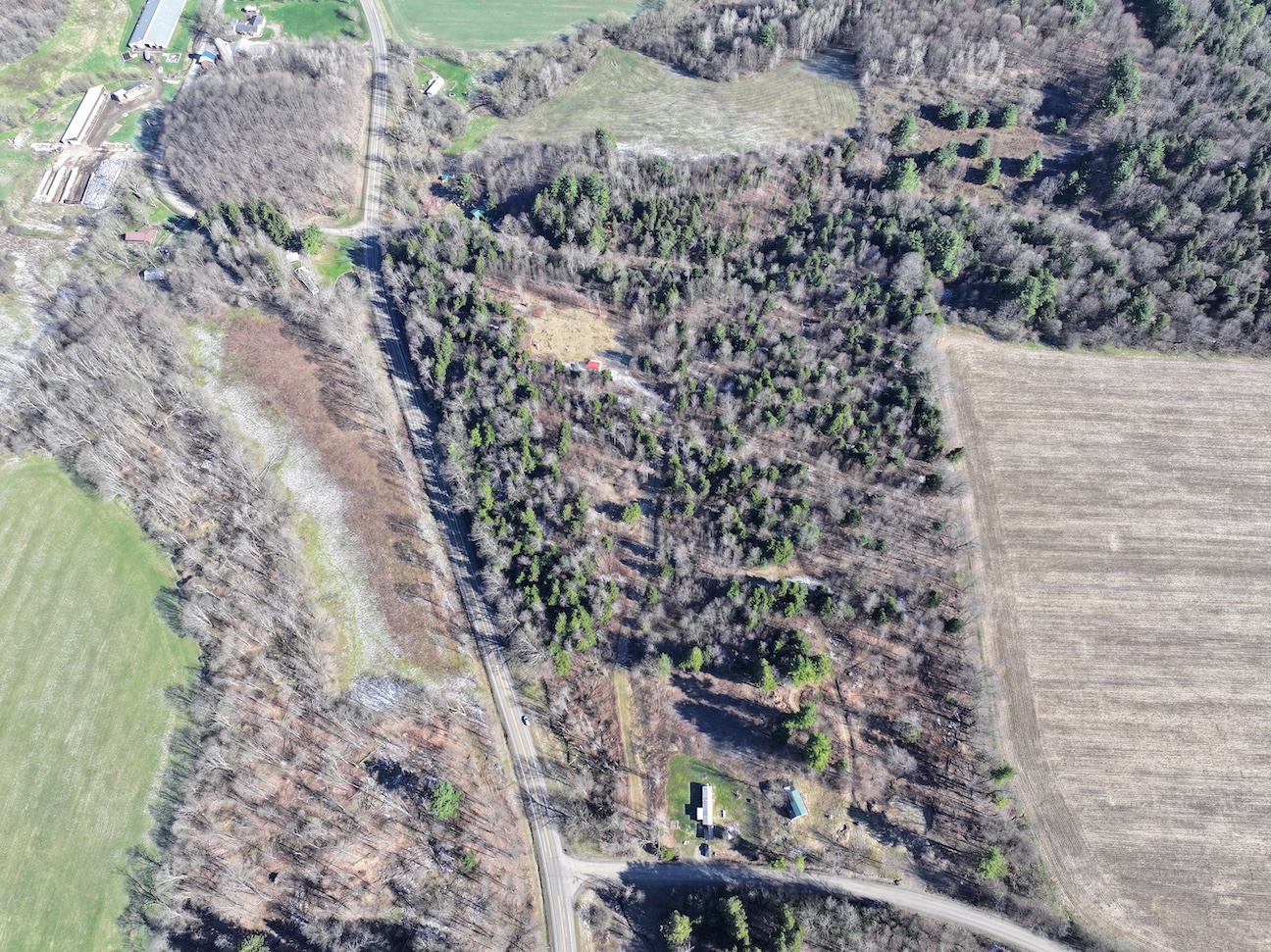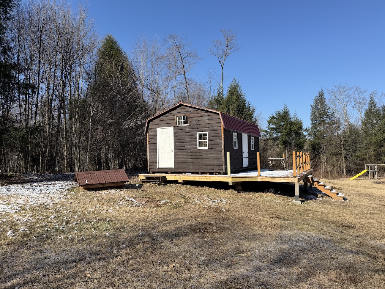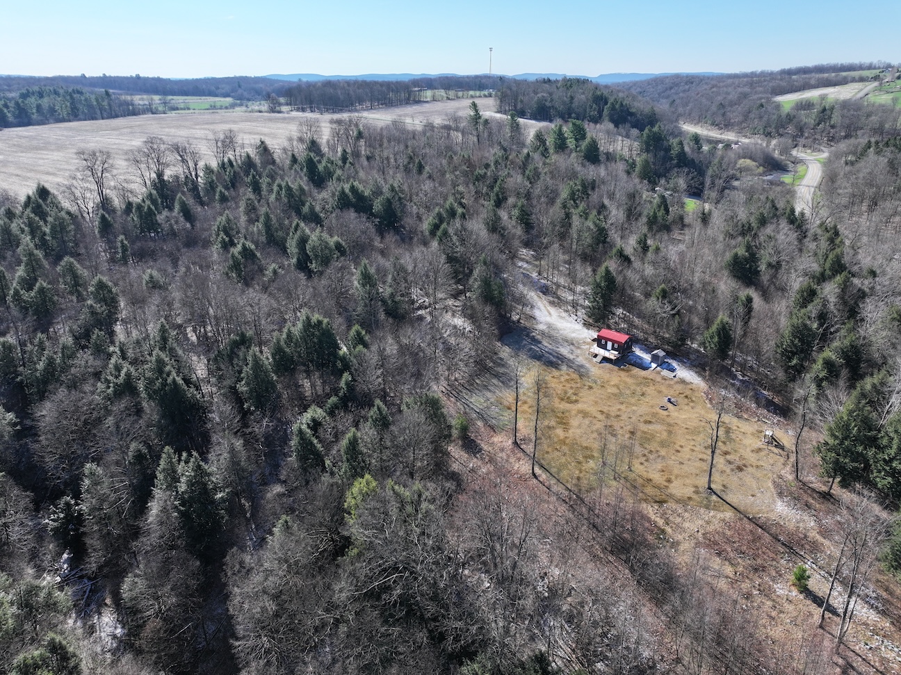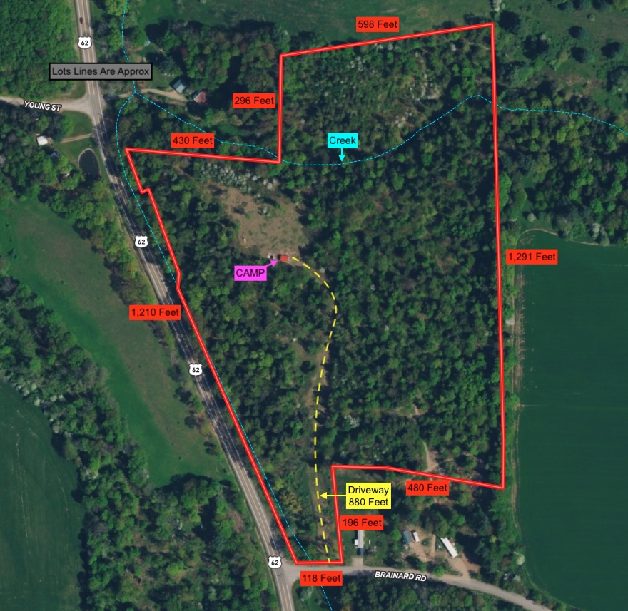 The land is a mixture of hardwoods and pine trees. The majority of the property is mostly level with a slight decline down to the creek. Access to the property is off Brainard Road with a locked gate. The driveway is approximately 880 feet to the cabin. There is also about 1,210 feet of frontage off Route 62. The cabin is 20 x 14 with no utilities, so it is completely off grid. There is a heater inside powered by propane. Next to the cabin is a shed that is included with the sale. There is a large open area around the cabin, approximately half an acre of open level ground perfect to bring in multiple campers to enjoy the property. This area is secluded from the road for ultimate privacy. Whitetail deer and turkey sign throughout for excellent hunting. Electric is located at the road. Annual taxes are $739.96. All rights convey.