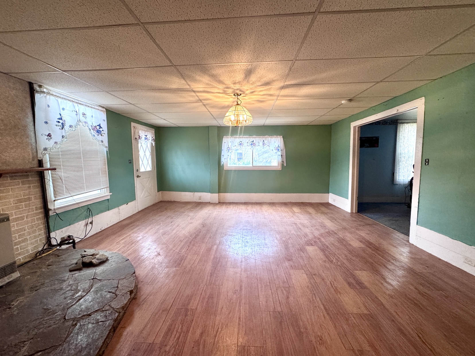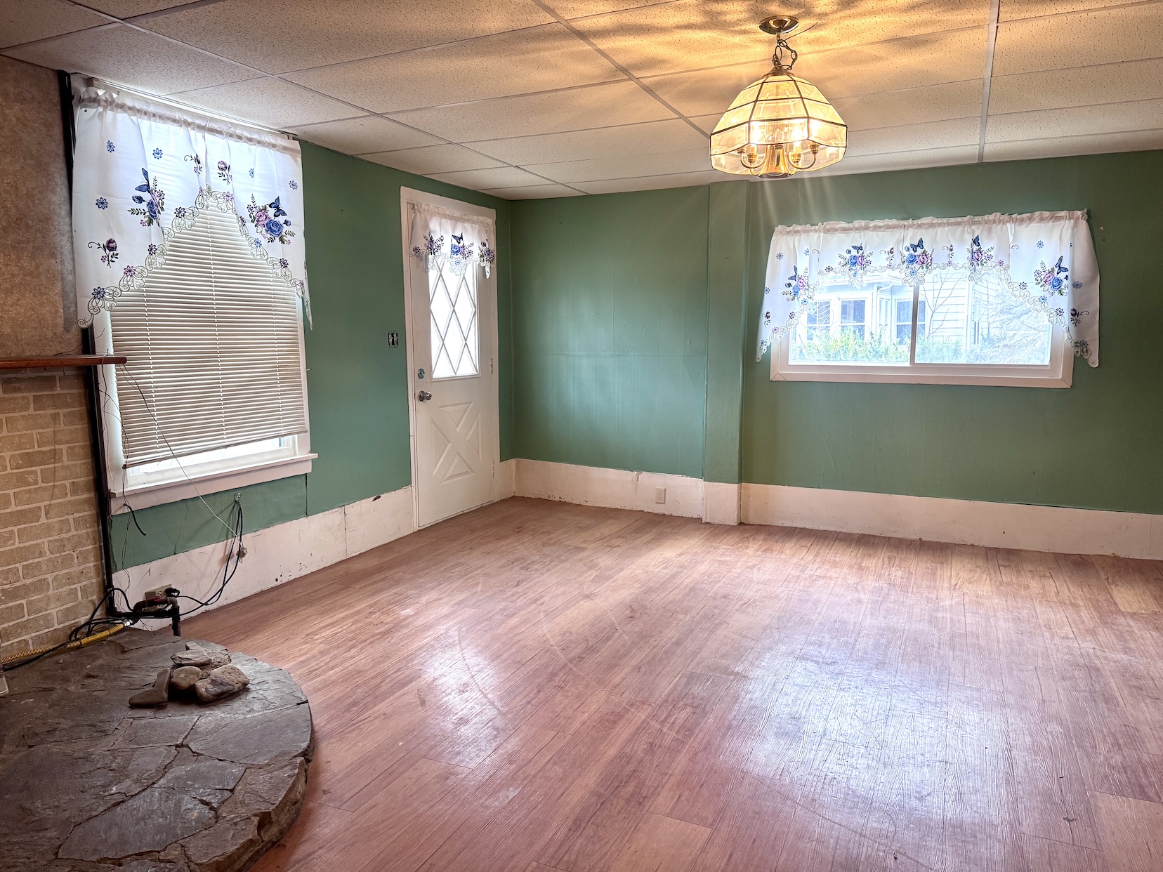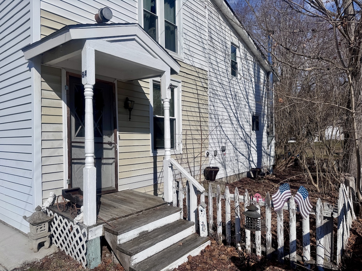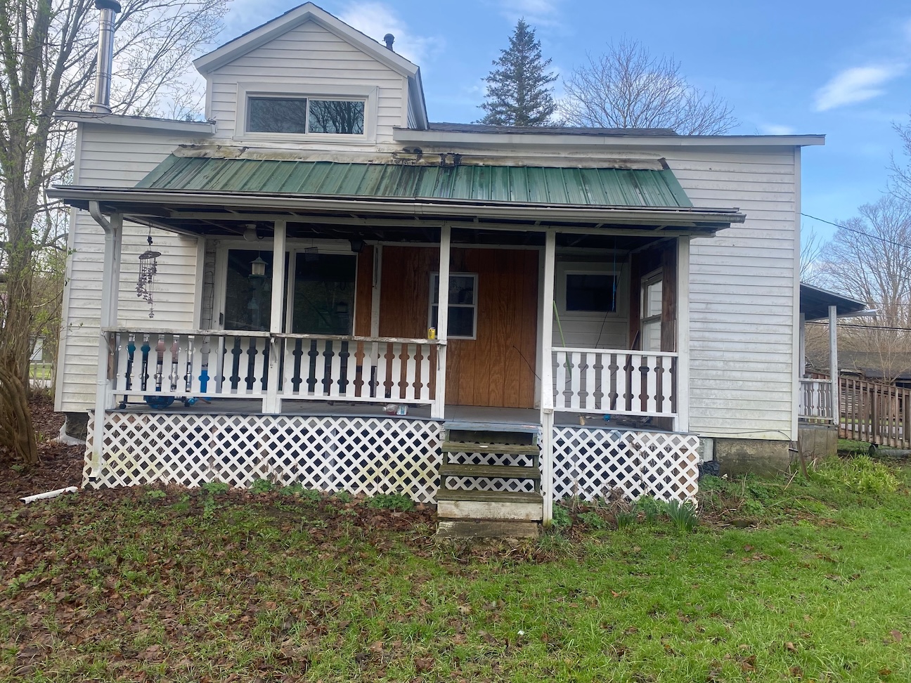 The home features a generously sized eat-in kitchen with endless potential for customization, complete with a charming breakfast nook and built-in cabinetry. Just off the kitchen, sliding glass doors lead to a newer covered porch, an ideal spot to enjoy your morning coffee while overlooking the backyard. There’s also an opportunity to add a wood or pellet stove, creating a warm inviting atmosphere.
