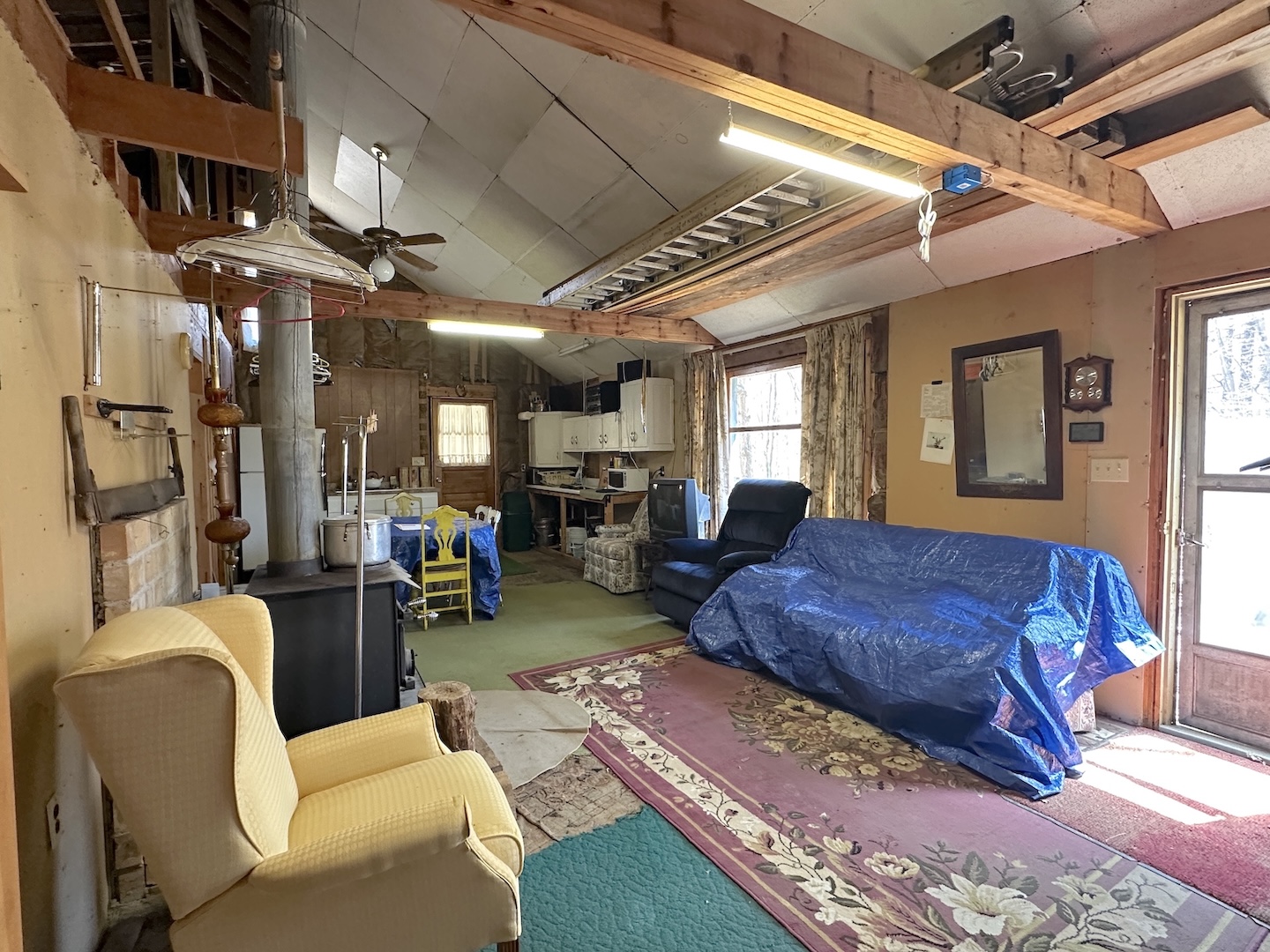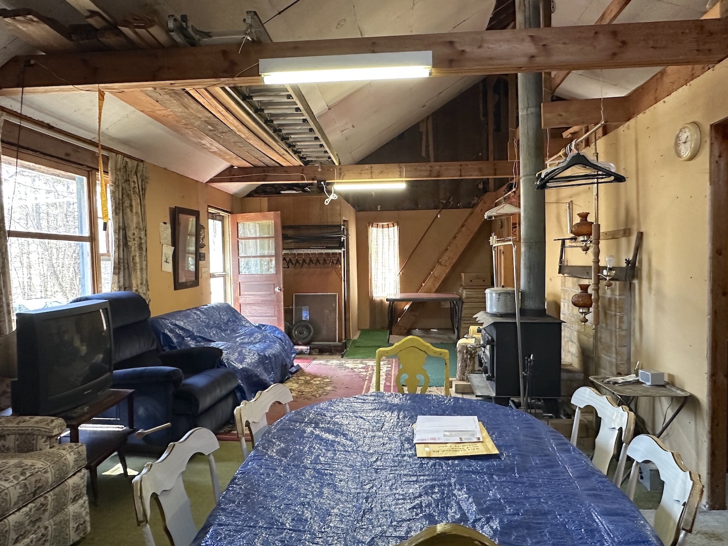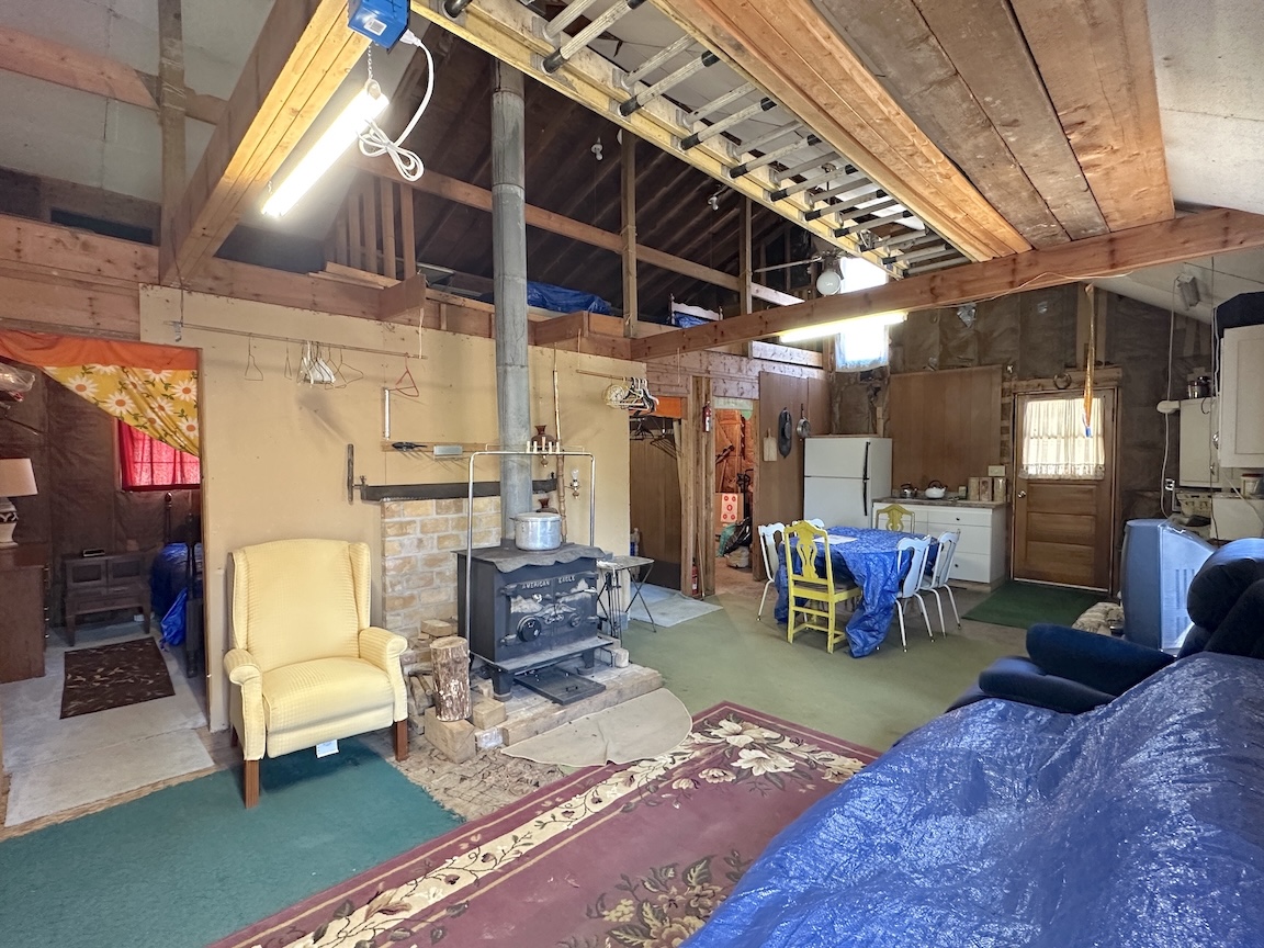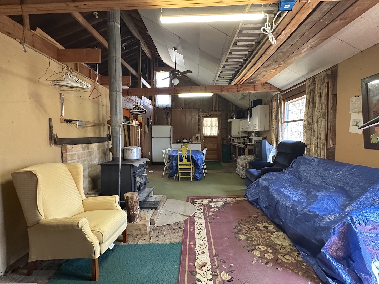 The cabin features an open living and dining area with a wood stove for heat, kitchen space, and multiple sleeping areas including three bedrooms and a loft. Electric service is already connected. The property is being sold as-is and includes the furnishings currently in the cabin allowing it to be used immediately as a hunting camp or recreational getaway.