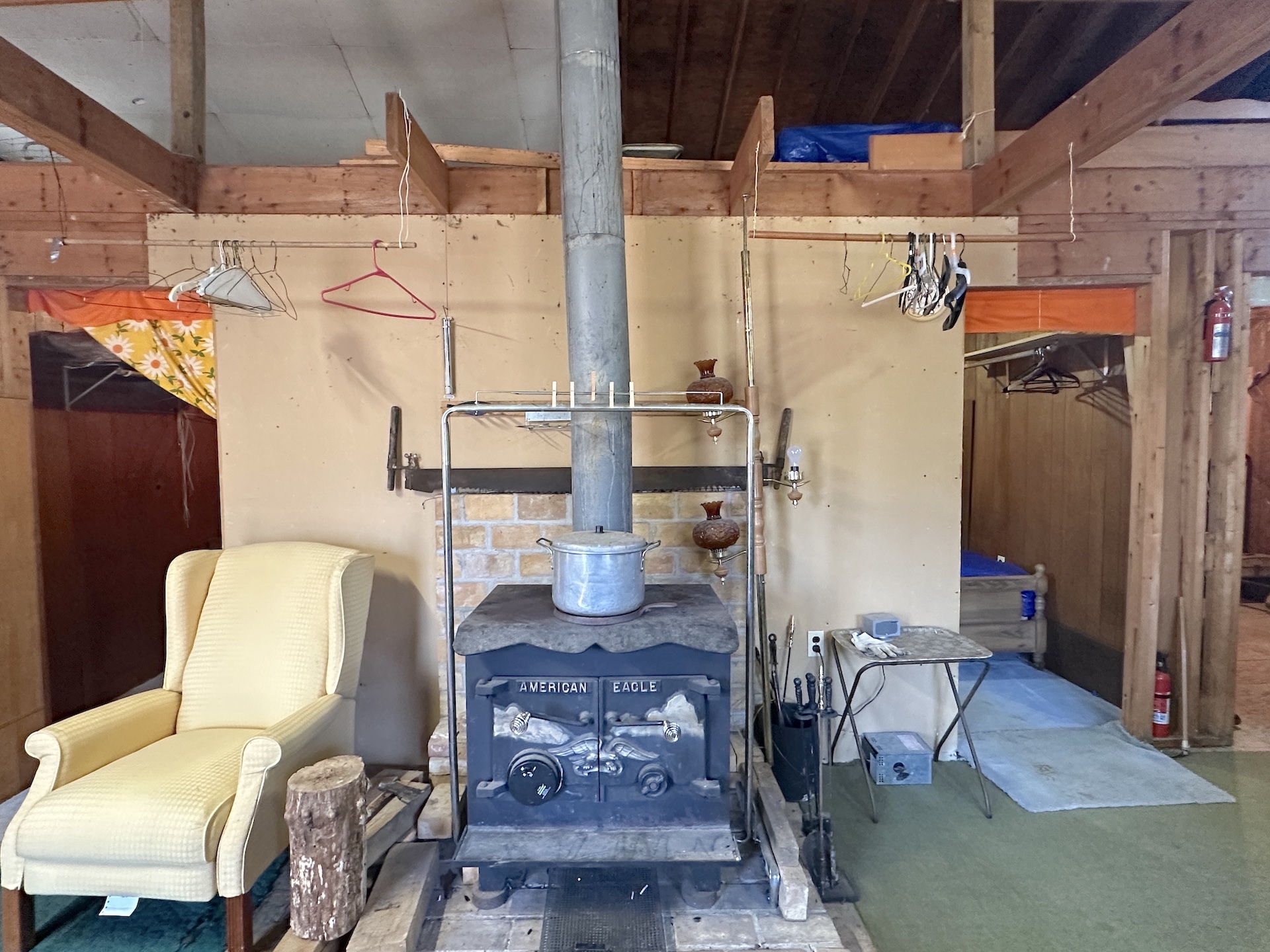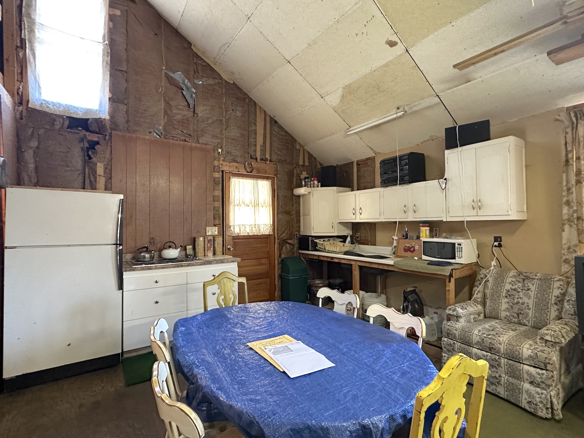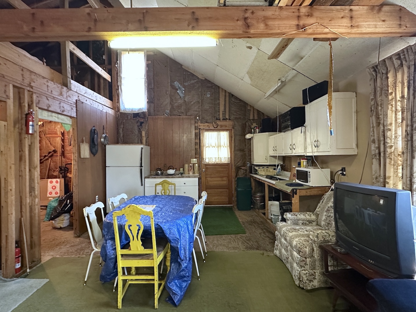 The cabin features an open living and dining area with a wood stove for heat, kitchen space, and multiple sleeping areas including three bedrooms and a loft. Electric service is already connected. The property is being sold as-is and includes the furnishings currently in the cabin allowing it to be used immediately as a hunting camp or recreational getaway.
