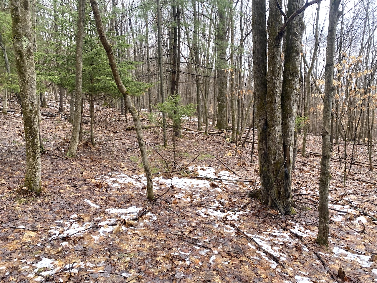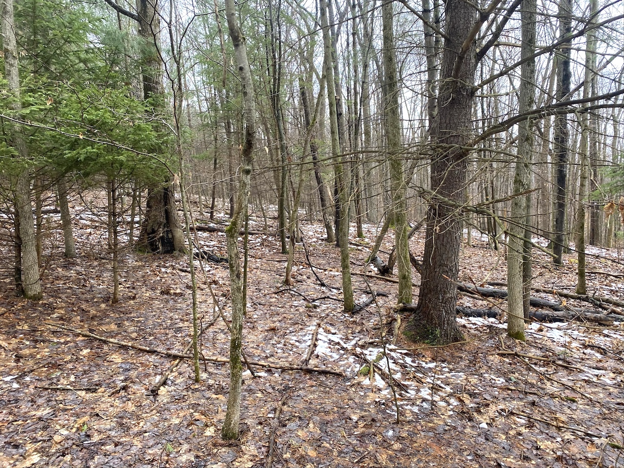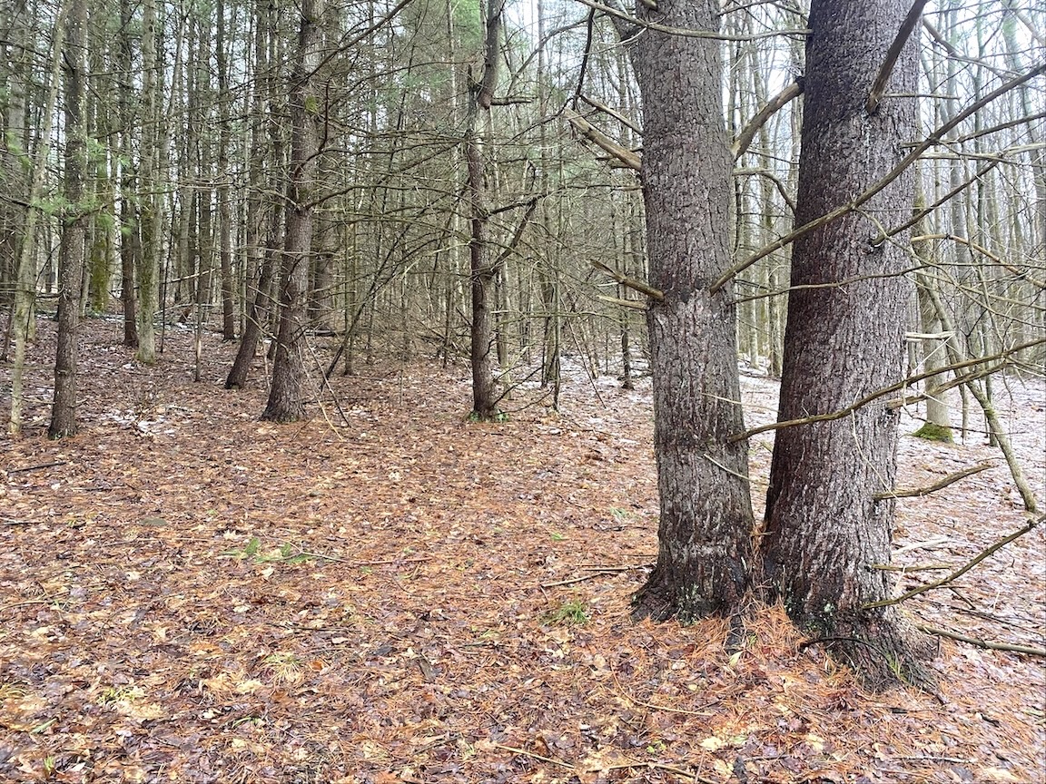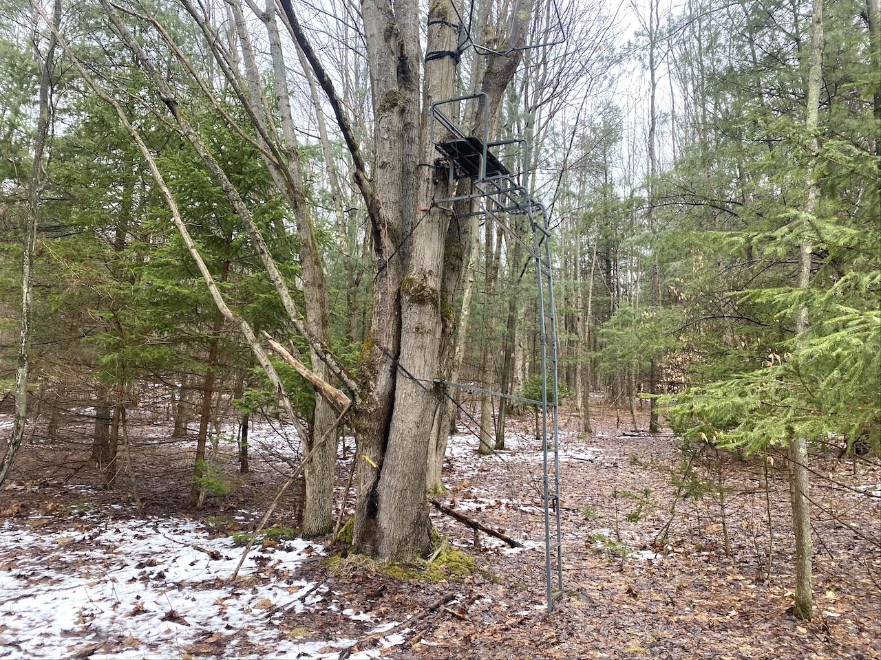 The 6.9 acres consist of mature woods with a mix of hardwoods and evergreens and gently sloping terrain that provides good wildlife habitat and natural cover. Three tree stands are already in place and will convey with the sale.